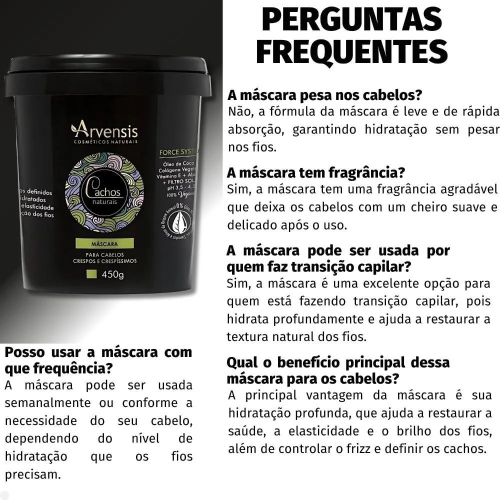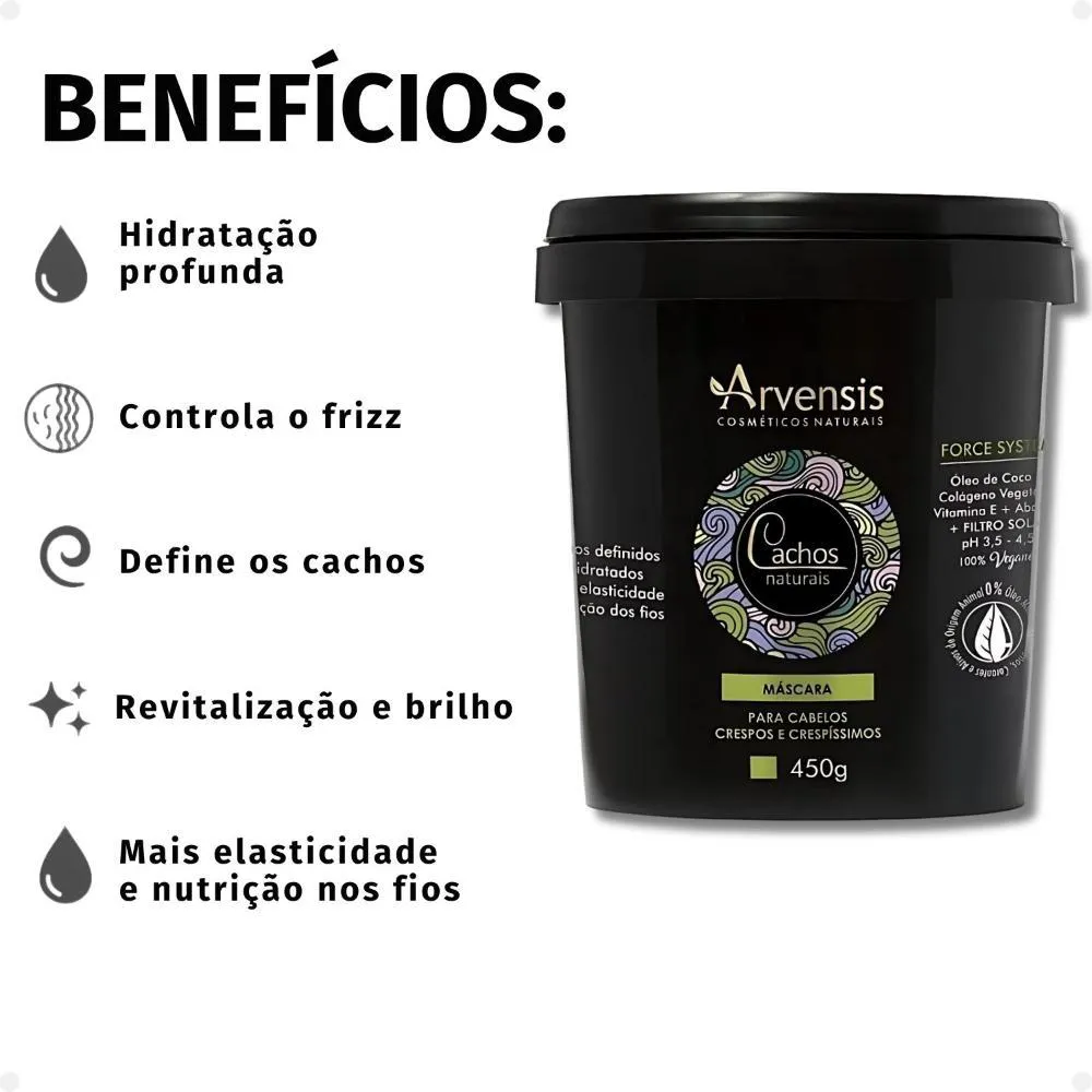 Máscara Arvensis Cachos Naturais Cabelos Crespos e Crespíssimos A Máscara Arvensis Cachos Naturais é uma máscara de tratamento intensivo desenvolvida especialmente para cabelos crespos e crespíssimos. Com sua fórmula rica em ativos hidratantes e nutritivos, ela proporciona uma hidratação profunda, restaurando a saúde e a elasticidade dos fios. A máscara ajuda a definir os cachos, controlando o frizz e garantindo um efeito mais alinhado e macio. Seu uso regular promove a revitalização dos cabelos, deixando-os mais hidratados, brilhantes e com um toque suave, sem pesar. Ideal para cabelos que necessitam de uma dose extra de hidratação e nutrição, a Máscara Arvensis Cachos Naturais é a escolha perfeita para quem busca manter a beleza e a saúde dos cabelos crespos e crespíssimos, com cachos bem cuidados e definidos. Cachos definidos e hidratados, além de maior elasticidade e nutrição dos fios. . -Dermatologicamente testado. -Óleo de Coco -colágeno Vegetal -vitamina e -Abacate -pH 3,5 - 4,5 . Modo de Uso Após o uso do shampoo, aplicar a máscara por toda extensão dos fios massageando suavemente, mecha a mecha. Deixar em contato de 10 a 15 minutos. Enxaguar com água em abundância. Caso prefira pode ser usado sem enxágue para atuar como leave-in. Precauções Somente para uso externo. Manter fora do alcance de crianças. Caso ocorrer alguma irritação, suspender o uso. Manter em local fresco e longe da iluminação solar. . Perguntas Frequentes Qual o benefício principal dessa máscara para os cabelos? A principal vantagem da máscara é sua hidratação profunda, que ajuda a restaurar a saúde, a elasticidade e o brilho dos fios, além de controlar o frizz e definir os cachos. Posso usar a máscara com que frequência? A máscara pode ser usada semanalmente ou conforme a necessidade do seu cabelo, dependendo do nível de hidratação que os fios precisam. A máscara pesa nos cabelos? Não, a fórmula da máscara é leve e de rápida absorção, garantindo hidratação sem pesar nos fios. A máscara tem fragrância? Sim, a máscara tem uma fragrância agradável que deixa os cabelos com um cheiro suave e delicado após o uso. A máscara pode ser usada por quem faz transição capilar? Sim, a máscara é uma excelente opção para quem está fazendo transição capilar, pois hidrata profundamente e ajuda a restaurar a textura natural dos fios. . Código de Registro Sanitário (ANVISA) 25351.433383/2016-68