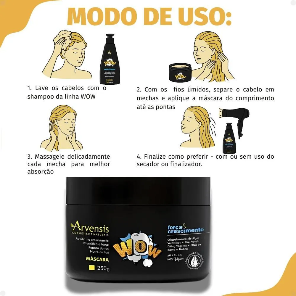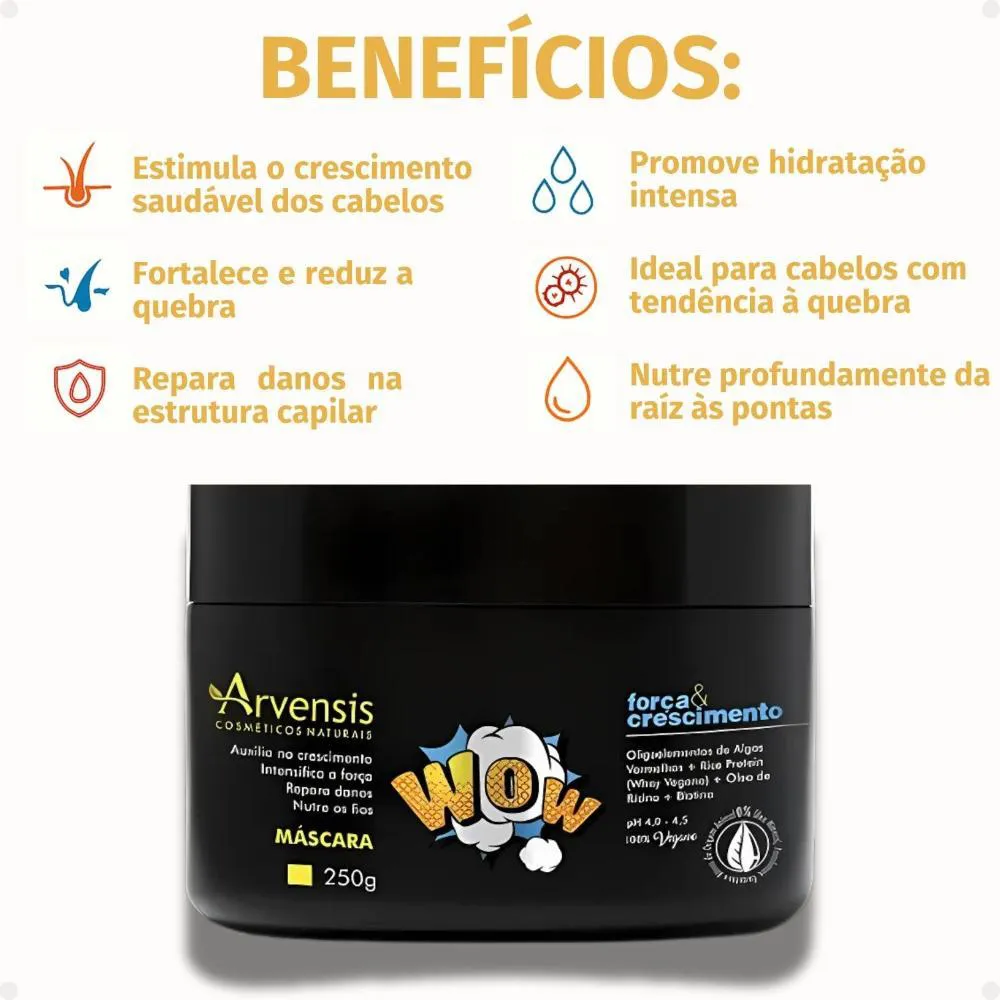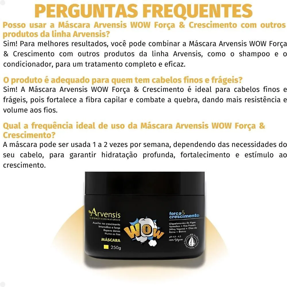 Máscara Arvensis WOW Força & Crescimento 250g A Máscara Arvensis WOW Força & Crescimento 250g é o tratamento ideal para fortalecer e estimular o crescimento saudável dos cabelos. Com uma fórmula enriquecida com ingredientes naturais, ela age profundamente na fibra capilar, promovendo hidratação intensa e revitalização dos fios. A máscara ajuda a reparar cabelos fragilizados, reduzindo a quebra e promovendo um crescimento mais saudável e resistente. Ideal para cabelos com tendência à queda ou danificados, ela nutre e fortalece desde a raiz até as pontas, deixando os fios mais encorpados, hidratados e com um brilho natural. Use regularmente para cabelos mais fortes, com mais volume e visivelmente mais longos. A Máscara Arvensis WOW Força & Crescimento oferece um cuidado completo, proporcionando cabelos saudáveis e revitalizados. . -Dermatologicamente testado. -Óleo de Rícino -Oligoelementos de algas vermelhas -Rice Protein (Whey Vegano) -Biotina -Filtro Solar -100% vegano . Modo de Usar Após o uso do shampoo, aplicar a Máscara WOW Força e Crescimento por toda extensão dos fios massageando suavemente, mecha a mecha. Deixar em contato de 10 a 15 minutos. Enxaguar com água em abundância. O uso completo dos produtos da linha WOW Força e Crescimento favorece os resultados. Precauções Somente para uso externo. Manter fora do alcance das crianças. Caso ocorrer alguma irritação, suspender o uso. Manter em local fresco e longe da iluminação solar. . Perguntas Frequentes Como a Máscara Arvensis WOW Força & Crescimento ajuda no crescimento do cabelo? Sua fórmula contém ingredientes naturais que ajudam a estimular a circulação do couro cabeludo e fortalecer as raízes, criando um ambiente propício para o crescimento saudável e acelerado dos fios. Qual a frequência ideal de uso da Máscara Arvensis WOW Força & Crescimento? A máscara pode ser usada 1 a 2 vezes por semana, dependendo das necessidades do seu cabelo, para garantir hidratação profunda, fortalecimento e estímulo ao crescimento. O produto é adequado para quem tem cabelos finos e frágeis? Sim! A Máscara Arvensis WOW Força & Crescimento é ideal para cabelos finos e frágeis, pois fortalece a fibra capilar e combate a quebra, dando mais resistência e volume aos fios. Posso usar a Máscara Arvensis WOW Força & Crescimento com outros produtos da linha Arvensis? Sim! Para melhores resultados, você pode combinar a Máscara Arvensis WOW Força & Crescimento com outros produtos da linha Arvensis, como o shampoo e o condicionador, para um tratamento completo e eficaz. . Código de Registro Sanitário(ANVISA) 25351.499647/2016-88