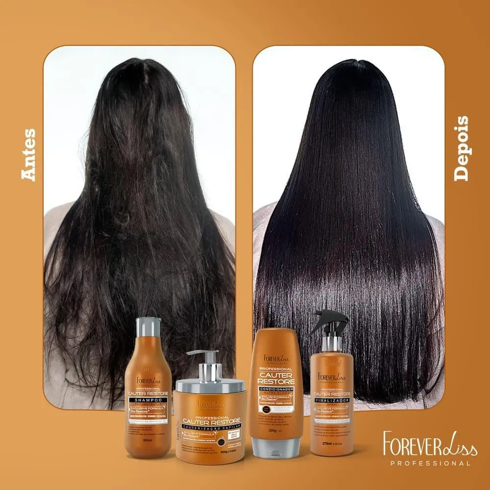 A Cauter Restore Forever Liss é um tratamento capilar com ação reconstrutora, ideal para cabelos danificados por química ou agressões externas. Sua fórmula termoativada com Ceramidas, Queratina Brasileira, Geléia Real e Aminoácidos repara profundamente os fios, devolve nutrientes essenciais e sela as cutículas, promovendo cabelos mais fortes, hidratados e com brilho.