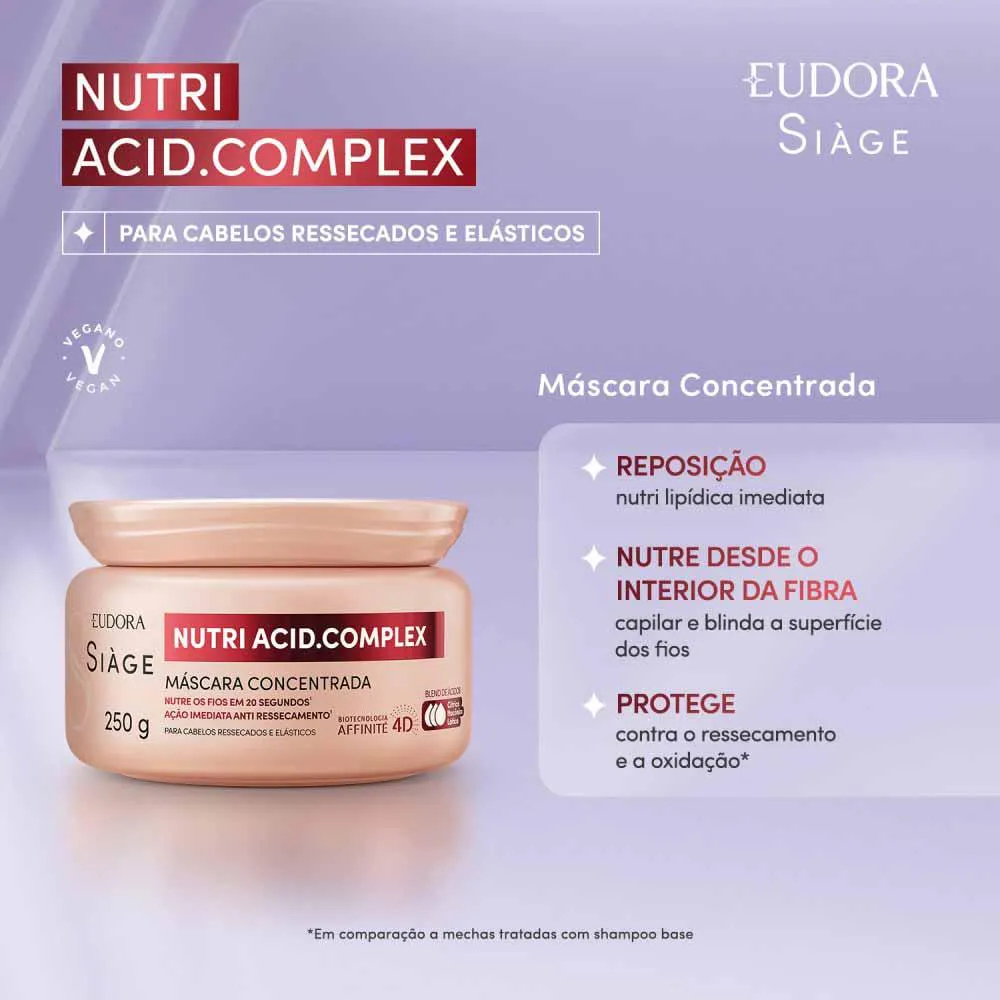 A Eudora Siàge Nutri Acid.Complex Máscara Capilar Concentrada é uma máscara capilar inovadora, projetada especificamente para tratar cabelos ressecados e elásticos. Este produto faz parte da nova linha Siàge Nutri Acid.Complex, que combina um poderoso blend de ácidos e óleos nutritivos para regenerar todas as camadas do fio, da cutícula até o córtex. Enriquecida com ácidos e óleos, a máscara nutre a fibra capilar desde o interior, promovendo cabelos mais macios e com brilho radiante.