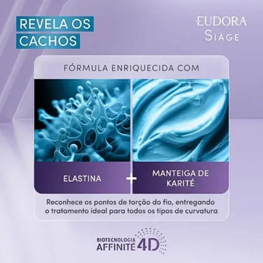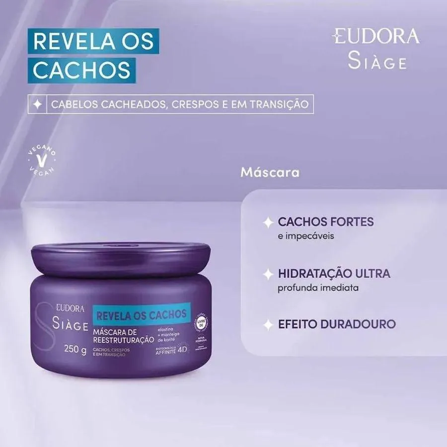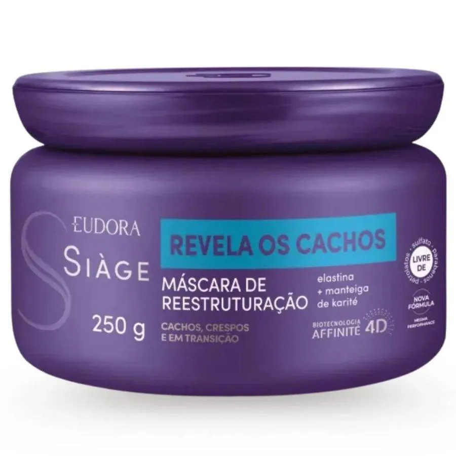 Siàge Revela os Cachos - Máscara Capilar de Reestruturação 250g Máscara Revela os Cachos Reestruturação Siàge da Eudora promove uma reestruturação completa para cabelos cacheados, ondulados, crespos e em transição. Sua fórmula com elastina e manteiga de karité reconhece os pontos de torção dos fios, entregando tratamento personalizado para todos os tipos de curvatura. Benefícios: Alta definição dos cachos; 2x mais hidratação; Força e elasticidade; 3x menos frizz; Reestruturação dos fios danificados e rebeldes. Principais ativos: Elastina, manteiga de karité (Butyrospermum Parkii), óleo de abacate (Persea Gratissima), pantenol, proteínas vegetais (proteína de trigo e soja hidrolisada).