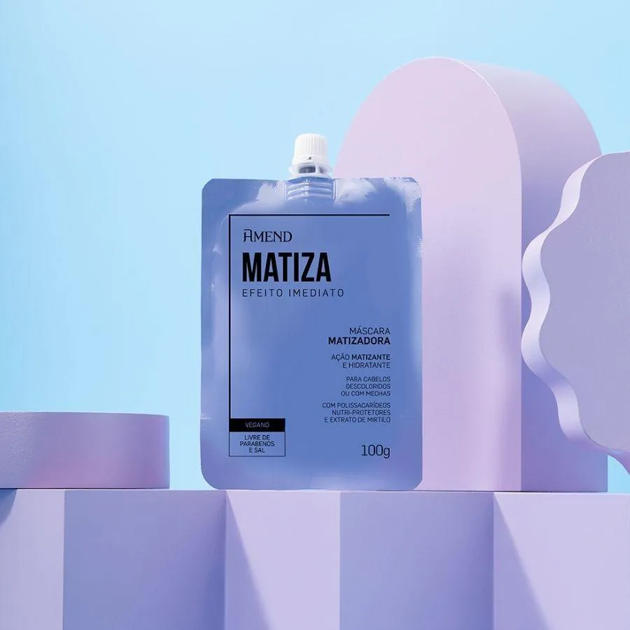 Amend Matiza Máscara Matizadora Efeito Imediato Sua fórmula possui alta concentração de pigmentos e neutraliza instantaneamente os tons amarelados e alaranjados, revelando um loiro radiante e uniforme logo na primeira aplicação. Promove brilho e maciez, enquanto fortalece e repara os fios porosos e danificados, deixando-os mais resistentes à quebra e às agressões externas. Princípios ativos: Polissacarídeos Nutri-Protetores e Extrato de Mirtilo.