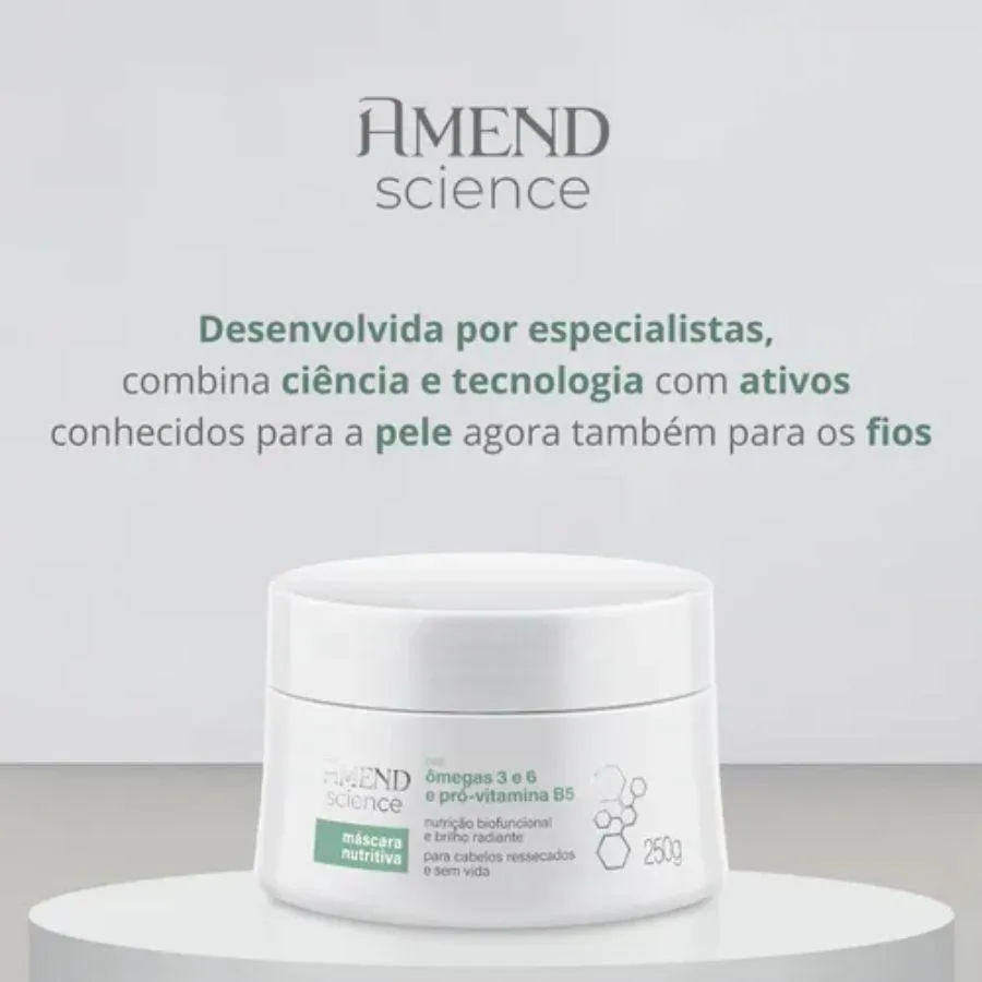 Máscara Nutritiva Amend Science A Linha Amend Science foi desenvolvida por especialistas que, unindo a ciência à tecnologia, combinaram ativos amplamente reconhecidos no segmento de cuidados com a pele para oferecer um produto de alta eficácia para os fios. A Máscara Nutritiva combina os Ômegas 3 e 6 com a Pró-Vitamina B5, ativos reconhecidos por suas propriedades condicionantes e umectantes, que, juntos, auxiliam na reposição dos lipídios perdidos e na lubrificação dos fios, formando uma barreira leve que protege a cutícula e retém a umidade no interior da fibra capilar. Essa ação reduz o ressecamento, garantindo brilho e maciez. Além disso, os ativos melhoram a elasticidade e aumentam a espessura dos fios, tornando-os mais flexíveis e menos propensos à quebra, e prevenindo a formação de pontas duplas. Como resultado, os cabelos ficam nutridos, macios, brilhantes e mais saudáveis. Características A fórmula foi desenvolvida por especialistas que, unindo ciência à tecnologia, combinaram os Ômegas 3 e 6 com a Pró-Vitamina B5. Juntos, esses ativos auxiliam na reposição dos lipídios perdidos e na lubrificação dos fios, formando uma barreira leve que protege a cutícula e retém a umidade no interior da fibra capilar. Além disso, melhoram a elasticidade, aumentam a espessura dos fios, tornando-os mais flexíveis e menos propensos à quebra, e previnem a formação de pontas duplas. Os cabelos ficam nutridos, macios, brilhantes e mais saudáveis.