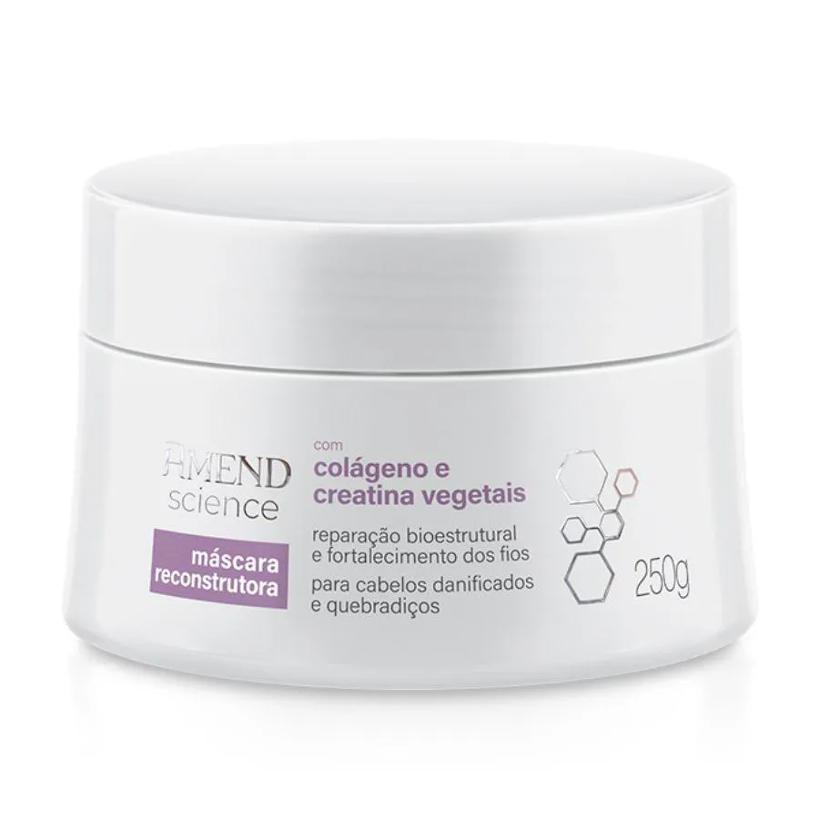 Máscara Reconstrutora Amend Science A Linha Amend Science foi desenvolvida por especialistas que, unindo a ciência à tecnologia, combinaram ativos amplamente reconhecidos no segmento de cuidados com a pele para oferecer um produto de alta eficácia para os fios. Formulada com colágeno Vegetal, que contribui para a produção de queratina - a proteína mais importante da estrutura capilar – e ajuda a preencher as áreas danificadas da fibra, deixando os fios mais fortes, resistentes e protegidos contra à quebra. A Creatina ajuda a recuperar os danos causados por coloração, descoloração, alisamentos, relaxamentos e agressões mecânicas, devolvendo o brilho e a maciez. Os cabelos ficam mais saudáveis, fortes, resistentes, sedosos e fáceis de pentear. Características A fórmula foi desenvolvida por especialistas que, unindo ciência à tecnologia, combinaram o Colágeno Vegetal — que contribui para a produção de queratina e ajuda a preencher as áreas danificadas da fibra — com a Creatina, que auxilia na recuperação dos danos causados por processos químicos e agressões mecânicas. O resultado são cabelos mais saudáveis, fortes, resistentes, sedosos, fáceis de pentear e com brilho.