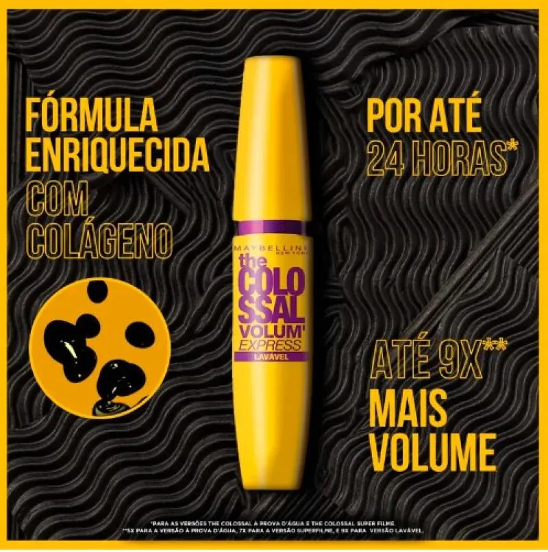 Maybelline The Colossal Volum'Express Lavável Preto Máscara de cílios preta. The Colossal Volum'Express Lavável Preto é bem pigmentada e realça o olhar com fios encorpados e volumosos. Enriquecida com colágeno e Agentes Espessantes, a Máscara de Cílios The Colossal Volum'Express garante volume e definição aos cílios de longa duração e 9x mais volume! As cerdas de alta tecnologia do The Colossal Maybelline proporcionam curvas sensacionais, máximo volume, e super definição, com apenas uma passada e sem auxílio de curvex. A textura lavável e muito pigmentada, não empelota ou gruda.