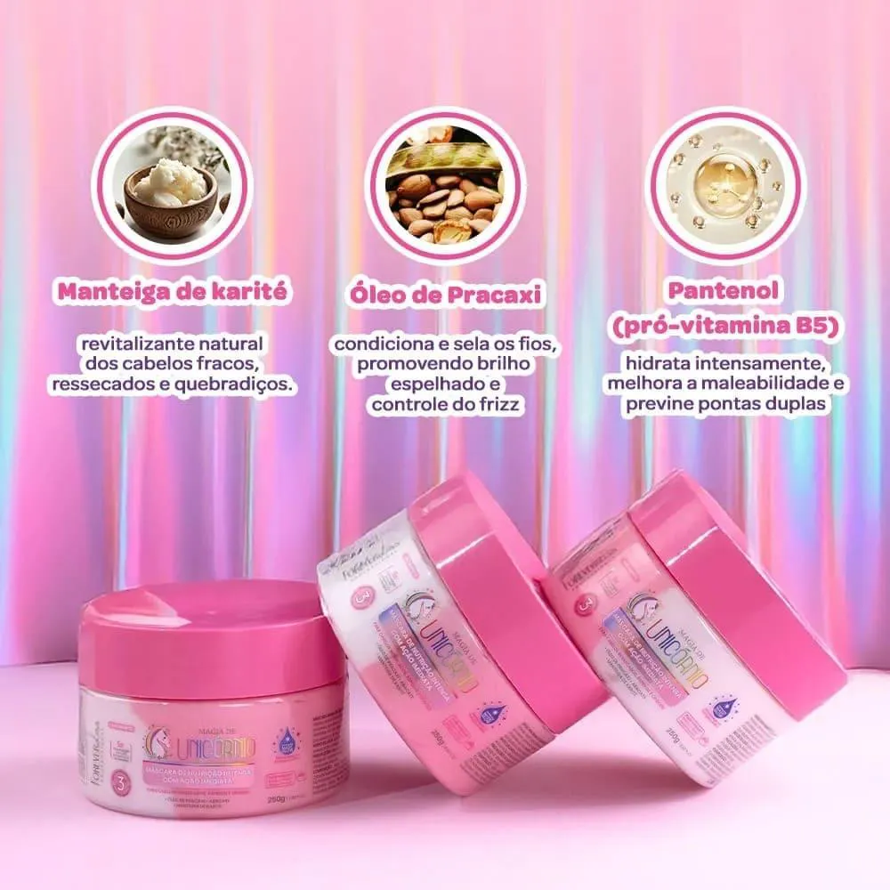 A Máscara Magia de Unicórnio é a aliada perfeita para quem busca nutrição intensa em poucos minutos. Com fórmula inovadora e textura aerada, ela age em apenas 3 minutos, entregando 5x mais nutrição, brilho espelhado e reparação profunda dos fios danificados por químicas ou agressões externas.