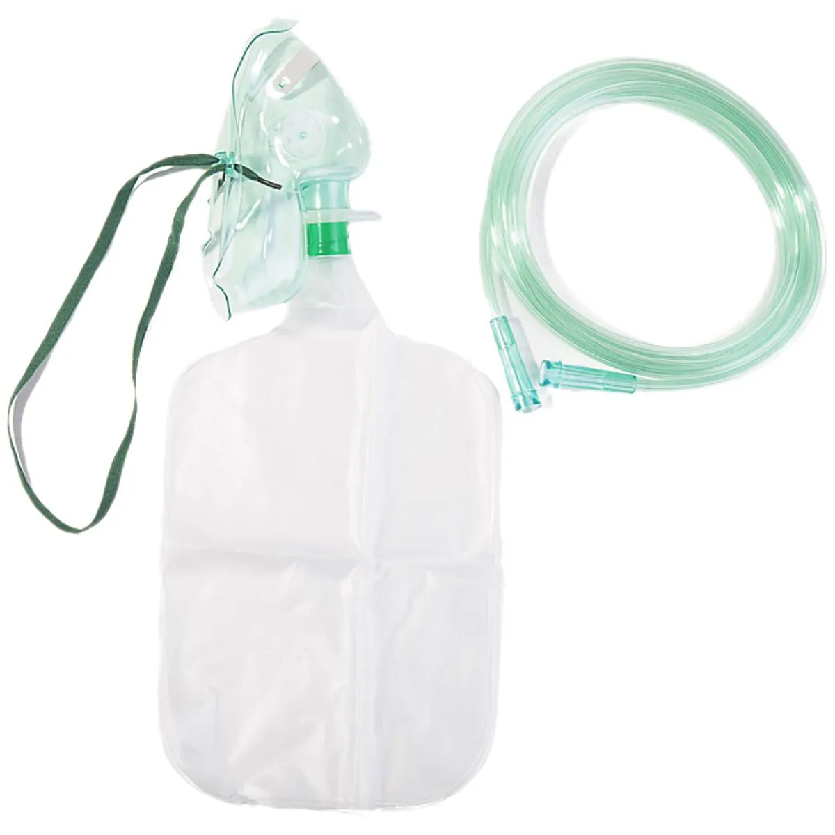 Máscara com elástico, balão para oxigênio e extensão para conexão em oxigênio.