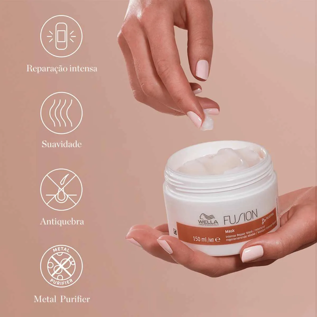 A fórmula cremosa de Wella Professionals Fusion Mask também possui agentes condicionantes que facilitam a finalização que você mais gosta do cabelo. Sua fragrância combina nove aromas que remetem à sofisticação, com seus toques de madeira florestal e notas de base quentes, como cedro e sândalo.AçãoFusion Silksteel: fusão de aminoácidos da seda e lipídios micronizados que penetram no interior do córtex para recuperar a condição ideal do fio e deixar o cabelo até 95% mais resistente.