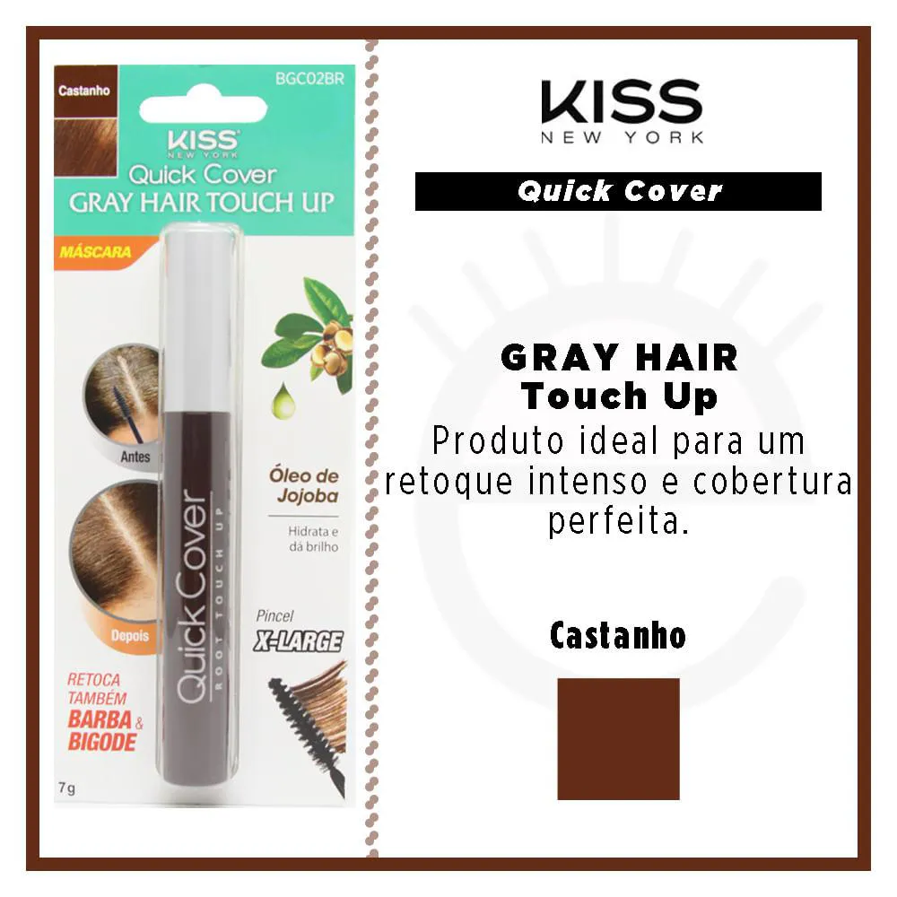 A Máscara Capilar Gray Hair Touch Up de Kiss NY é ideal para um retoque detalhado e eficaz, pois conta com um pincel extra-grande, que retoca fio a fio de forma rápida e natural. Além disso, ele também pode ser aplicado na barba e no bigode.
