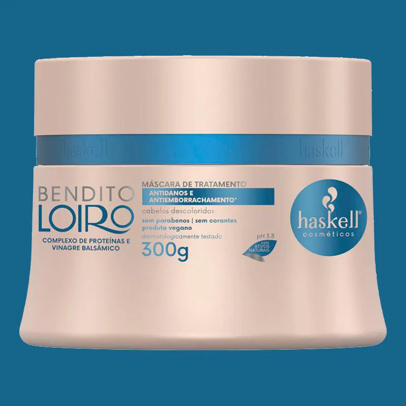 Máscara de Tratamento Bendito Loiro 300g - Haskell Indicação: cabelos descoloridos Proporciona tratamento profundo de regeneração dos fios loiros e restaura os cabelos dos danos causados pelo processo de descoloração. Ideal para recuperar os cabelos descoloridos; A linha possui ação antiemborrachamento e antiporosidade, protegendo os fios de danos futuros; Sua formulação conta com complexo de proteínas e vinagre balsâmico que, juntos, promovem a regeneração capilar de maneira intensiva, repondo a massa proteica nos fios. Direção olfativa: floral frutal Especificações: pH 3.8 sem parabenos | sem corantes low poo Etapa do cronograma: reconstrução Modo de usar: após lavar os cabelos, aplique a máscara mecha por mecha, do comprimento às pontas. Massageie e deixe agir de 3 a 5 minutos. Se preferir, faça o uso de touca térmica. Enxágue em seguida, retirando todo o resíduo de creme dos cabelos. Potencialize os resultados utilizando toda a linha Bendito Loiro. Imagens Meramente Ilustrativas. Todas as Informações Divulgadas são de Responsabilidade Exclusiva do Fabricante/fornecedor.