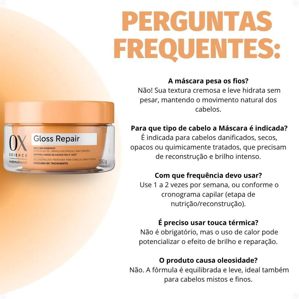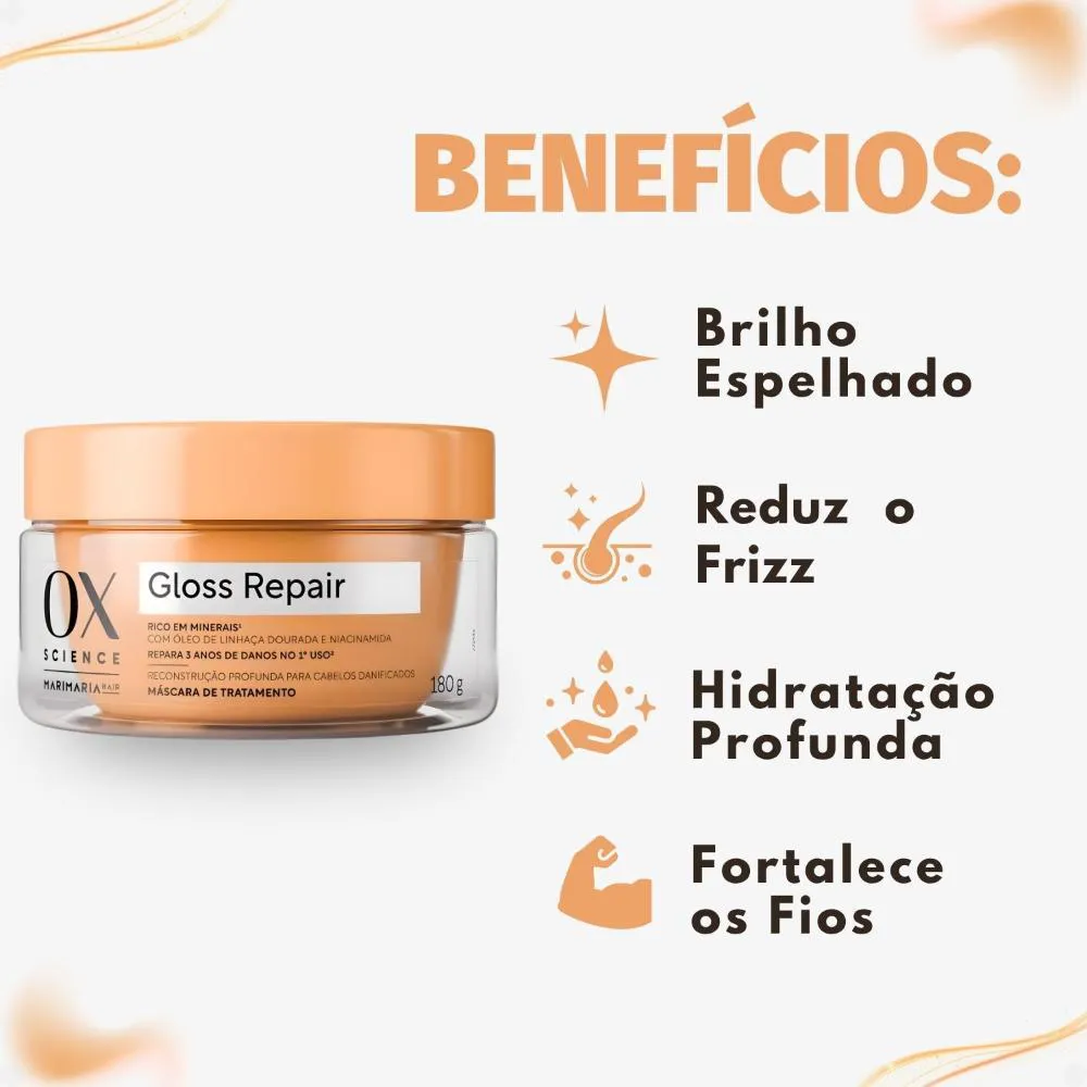 A Máscara de Tratamento Capilar Ox Science Mari Maria Hair Gloss Repair 180g foi desenvolvida para proporcionar uma reparação profunda e brilho espelhado aos fios. Com tecnologia avançada e fórmula concentrada, atua na reconstrução da fibra capilar, devolvendo força, maciez e movimento natural ao cabelo. Perfeita para fios danificados, opacos ou sensibilizados, ela promove hidratação intensa e efeito gloss imediato, deixando os cabelos deslumbrantes desde a primeira aplicação.Benefícios Principais