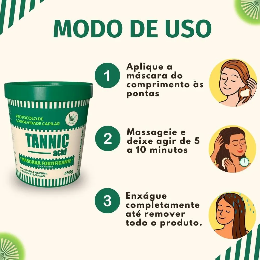 Após lavar os cabelos com o shampoo, retire o excesso de água e aplique uma quantidade generosa da Máscara Fortificante Lola Tannic Acid 450g mecha por mecha, massageando suavemente. Deixe agir por 5 a 10 minutos e enxágue abundantemente. Para um tratamento mais intensivo, utilize uma touca térmica durante o tempo de pausa.Anvisa: 25351.122781/2025-08