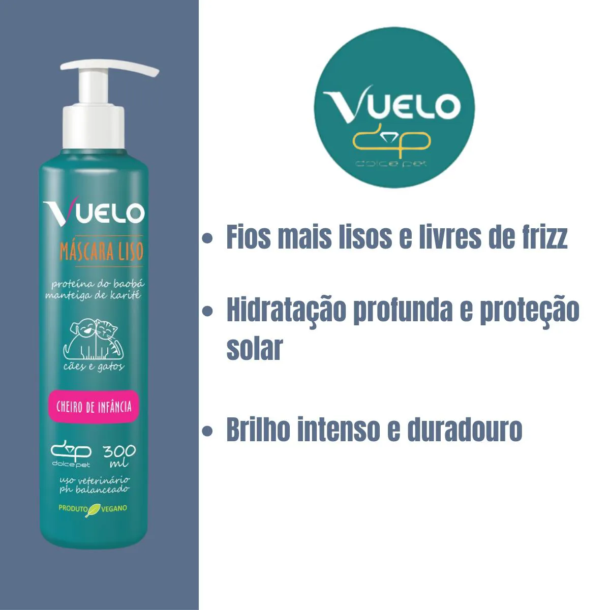 Máscara Liso Cheiro de Infância Vuelo – Brilho, Hidratação e Maciez para o Pelo do Seu Pet Transforme os pelos do seu pet com a Máscara Liso Cheiro de Infância Vuelo, desenvolvida para proporcionar um cuidado profundo e completo. Com uma fórmula especial que atua externa e internamente nos fios, essa máscara oferece uma redução do frizz e deixa os pelos mais lisos, leves e cheios de brilho. Combinando o poder de ingredientes naturais e nutritivos, a Máscara Liso Vuelo é enriquecida com: Proteína da Seda: Encorpa, nutre e fortalece os pelos, deixando-os sedosos e macios. Manteiga de Karité: Hidrata profundamente, garante um brilho intenso e protege contra os raios UVA e UVB. Proteína de Baobá: Nutre e condiciona os pelos, proporcionando uma experiência mais agradável durante a secagem, desembaraço e escovação. Este tratamento foi desenvolvido para pets de todas as idades, promovendo uma aparência saudável e confortável em cada aplicação. Ideal para uso frequente ou em momentos de cuidado especial, a Máscara Liso Vuelo garante um toque suave e uma finalização de salão. Fios mais lisos e livres de frizz Hidratação profunda e proteção solar Brilho intenso e duradouro Ideal para todas as raças e idades Dê ao seu pet um tratamento especial com a Máscara Liso Vuelo e deixe seus pelos com o brilho e a maciez que ele merece! Modo de Usar: Após higienizar seu pet com o shampoo LISO VUELO, remova o excesso de água. Derrame sobre a palma da mão a MÁSCARA LISO VUELO e aplique sobre os pelos. Massageie com as pontas dos dedos alcançando a totalidade da pelagem. Deixe agir por alguns minutos. Enxágue bem.