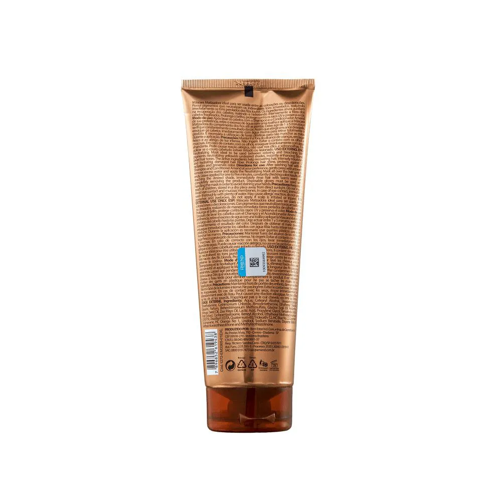 Modo de usar: Após lavar os cabelos com o shampoo e o condicionador Amend de sua preferência, retire o excesso de água com uma toalha e aplique a Máscara Matizadora do comprimento dos fios até as pontas. Deixe agir de 1 a 5 minutos e verifique constantemente o resultado da cor. Assim que atingir a nuance desejada, enxágue os cabelos imediatamente com água morna para retirar totalmente o produto. É recomendado a utilização de luvas plásticas para não manchar as mãos durante a aplicação.