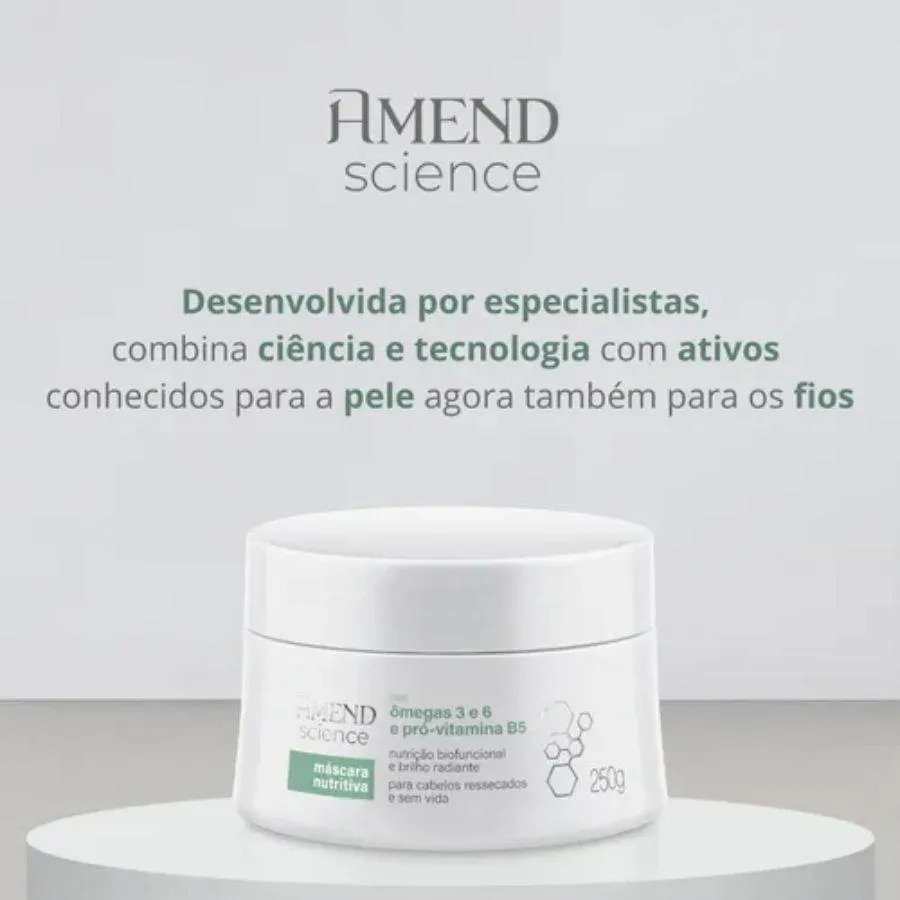 Máscara Nutritiva Amend Science A Linha Amend Science foi desenvolvida por especialistas que, unindo a ciência à tecnologia, combinaram ativos amplamente reconhecidos no segmento de cuidados com a pele para oferecer um produto de alta eficácia para os fios. A Máscara Nutritiva combina os Ômegas 3 e 6 com a Pró-Vitamina B5, ativos reconhecidos por suas propriedades condicionantes e umectantes, que, juntos, auxiliam na reposição dos lipídios perdidos e na lubrificação dos fios, formando uma barreira leve que protege a cutícula e retém a umidade no interior da fibra capilar. Essa ação reduz o ressecamento, garantindo brilho e maciez. Além disso, os ativos melhoram a elasticidade e aumentam a espessura dos fios, tornando-os mais flexíveis e menos propensos à quebra, e prevenindo a formação de pontas duplas. Como resultado, os cabelos ficam nutridos, macios, brilhantes e mais saudáveis.