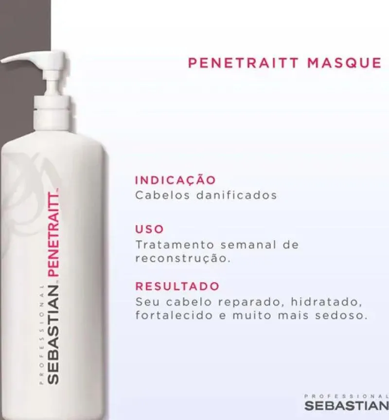 A Máscara Sebastian Penetraitt possui em sua fórmula ingredientes especiais que juntos agem como um sistema de resgate para reconstruir, reparar e restaurar os dados dos fios, fortalecendo os e doando resistência, flexibilidade e movimento enquanto hidrata profundamente a fibra, doando maciez, luminosidade e toque sedoso. Modo de usar: