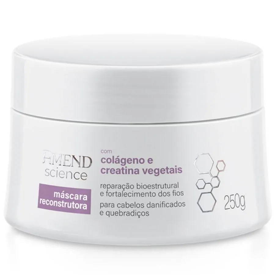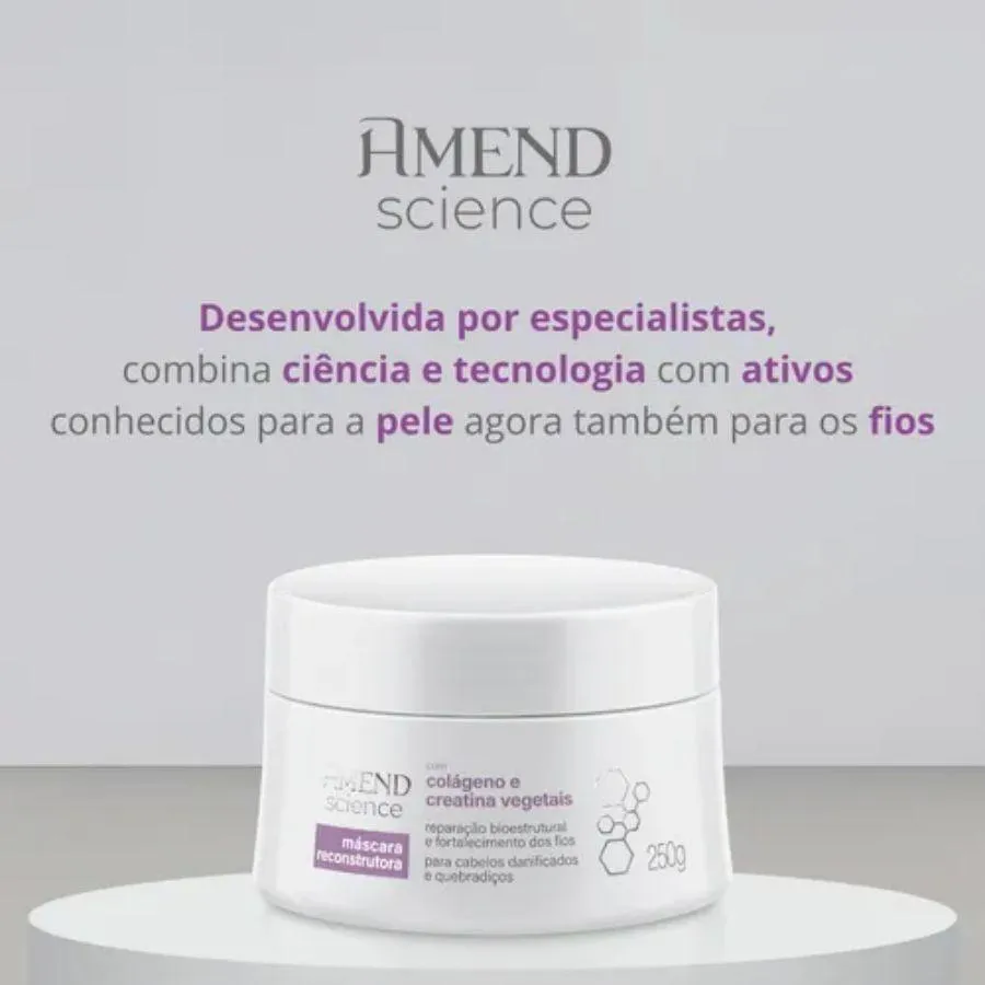 Máscara Reconstrutora Amend Science A Linha Amend Science foi desenvolvida por especialistas que, unindo a ciência à tecnologia, combinaram ativos amplamente reconhecidos no segmento de cuidados com a pele para oferecer um produto de alta eficácia para os fios. Formulada com colágeno Vegetal, que contribui para a produção de queratina - a proteína mais importante da estrutura capilar – e ajuda a preencher as áreas danificadas da fibra, deixando os fios mais fortes, resistentes e protegidos contra à quebra. A Creatina ajuda a recuperar os danos causados por coloração, descoloração, alisamentos, relaxamentos e agressões mecânicas, devolvendo o brilho e a maciez. Os cabelos ficam mais saudáveis, fortes, resistentes, sedosos e fáceis de pentear.