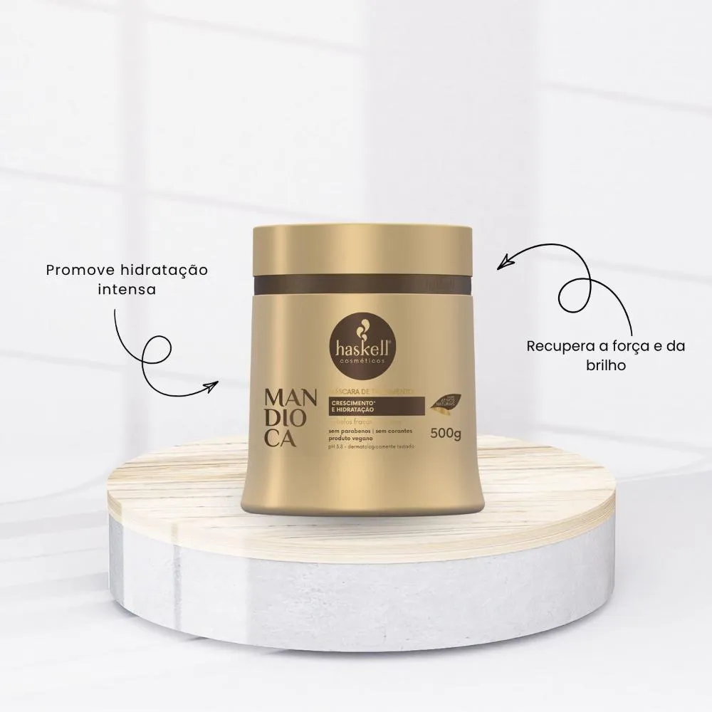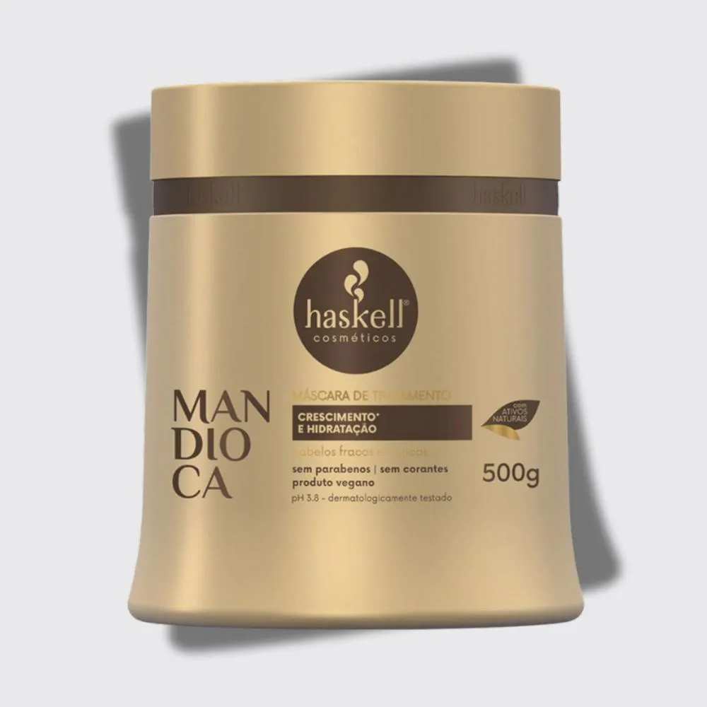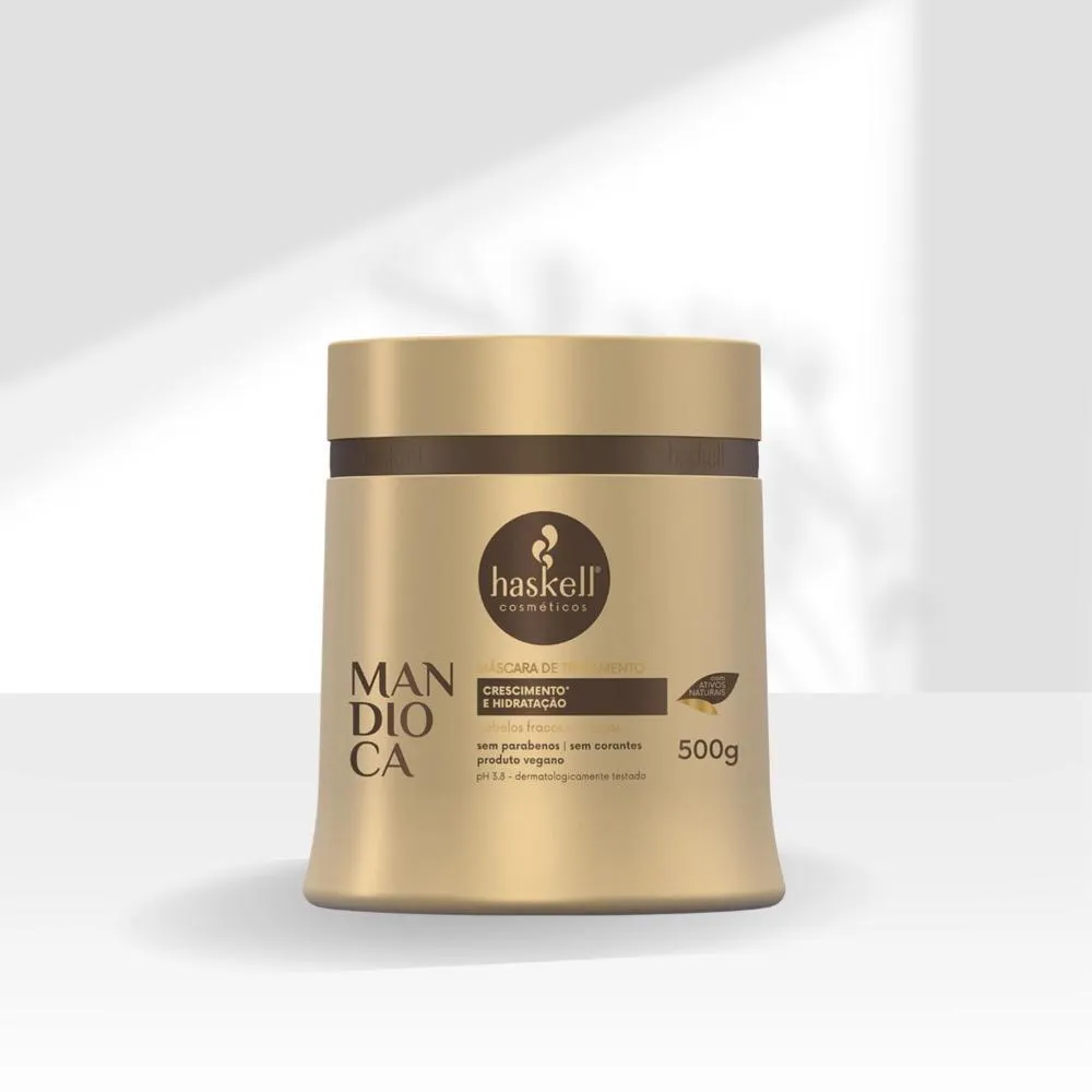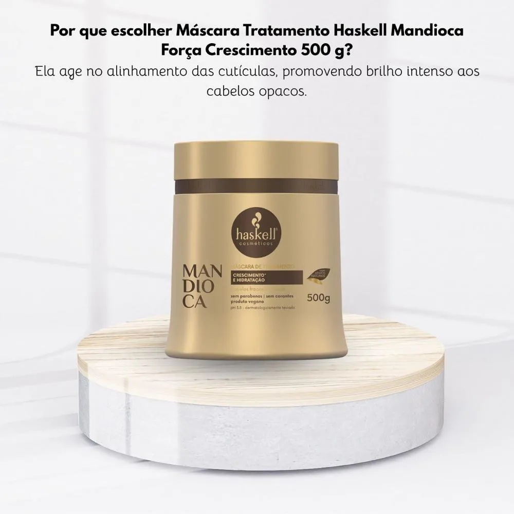 • Máscara Tratamento Haskell Mandioca Força Crescimento 500 g • Sugestões de uso:Shampoo Haskell Mandioca – prepara os fios