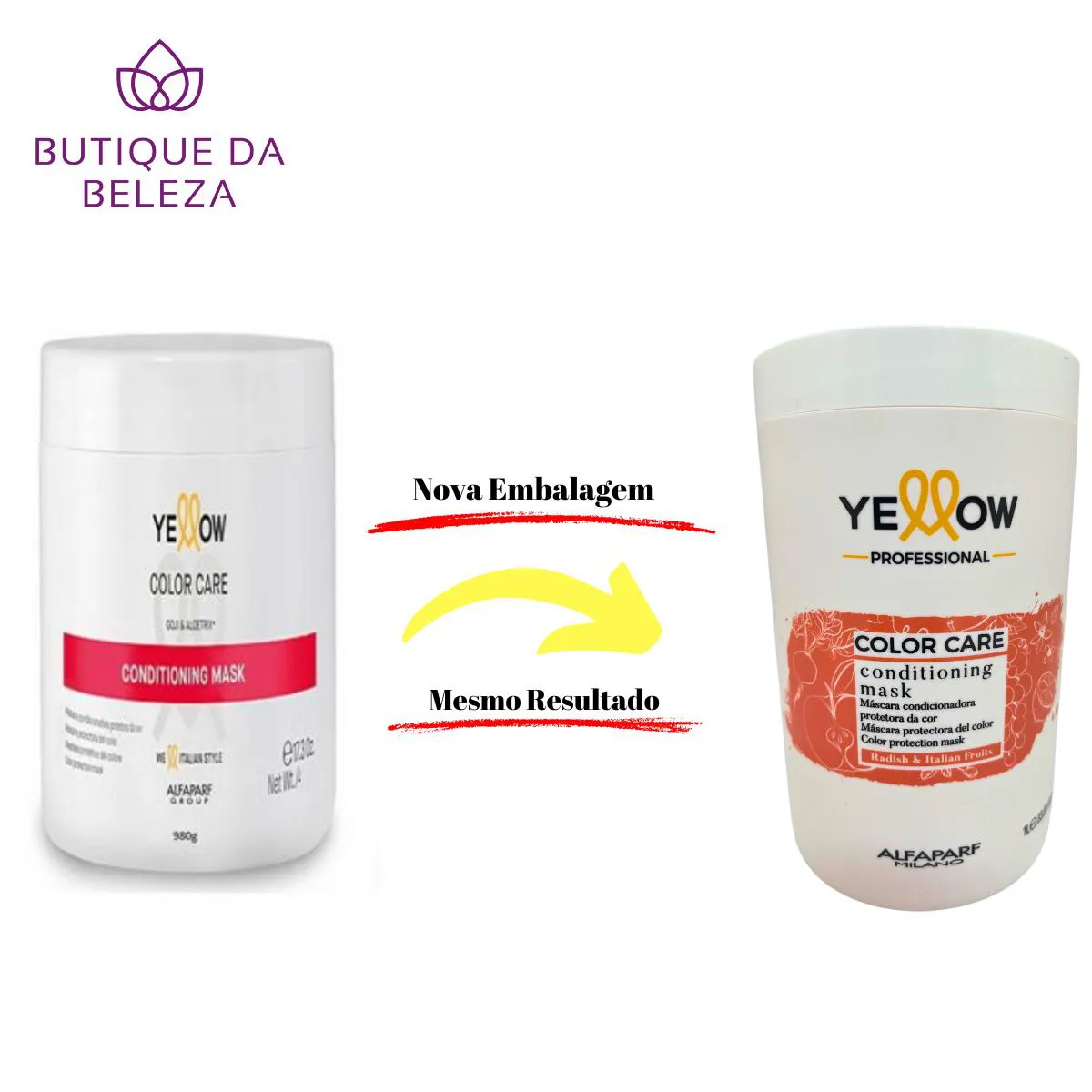 Somos a BUTIQUE DA BELEZA Uma empresa especializada no comércio de cosméticos e Semijoias. Estamos sempre entre os Melhores Vendedores. NOSSO COMPROMISSO É COM VOCÊ! SEU CONFORTO E SEGURANÇA SÃO NOSSOS PROPÓSITOS SERVIR E AJUDAR SÃO NOSSOS DEVERES APRESENTAÇÃO DA LINHA YELLOW COLOR CARE O ALIADO PERFEITO PARA OS CABELOS PINTADOS, NO SALÃO E EM casa. EXALTA E PRESERVA NO TEMPO A INTENSIDADE E O BRILHO DE CADA COR. OS RESULTADOS ?! DEPOIS DE 1 MÊS, COR COMO RECÉM APLICADA* 85% DA INTENSIDADE LUMINOSIDADE AMPLIADA* +41% DEPOIS DE UM SÓ TRATAMENTO* MÁSCARA YELLOW COLOR CARE - PARA CABELOS COLORIDOS Máscara protetora de cor REGENERA E NUTRE EM PROFUNDIDADE OS CABELOS COLORIDOS. AJUDA A PROLONGAR A INTENSIDADE DOS REFLEXOS E A MANTER OS CABELOS LUMINOSOS E MACIOS AO TATO. MODO DE USO APLICAR NOS CABELOS MOLHADOS. ESPERAR 5 MINUTOS. ENXAGUAR ABUNDANTEMENTE. Dica BUTIQUE DA BELEZA: para otimizar o resultado adquira conosco o shampoo PARA CABELOS COLORIDOS YELLOW COLOR CARE!