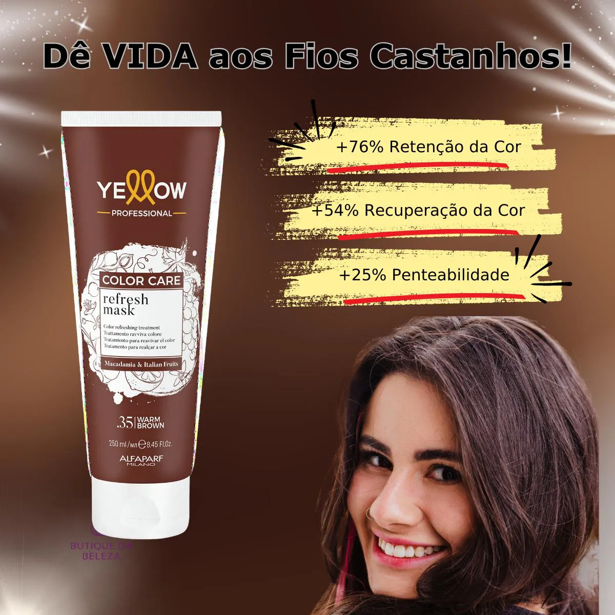 Proteção Contra Desbotamento: Preserva a cor e protege contra o amarelamento. MODO DE USO Aplique nos cabelos lavados, massageando do comprimento às pontas. Deixe agir por 3 a 5 minutos e enxágue. Use semanalmente para resultados consistentes. Com a Máscara Yellow Color Care Refresh Mask .35, seu cabelo loiro mantém a cor radiante e saudável por muito mais tempo!