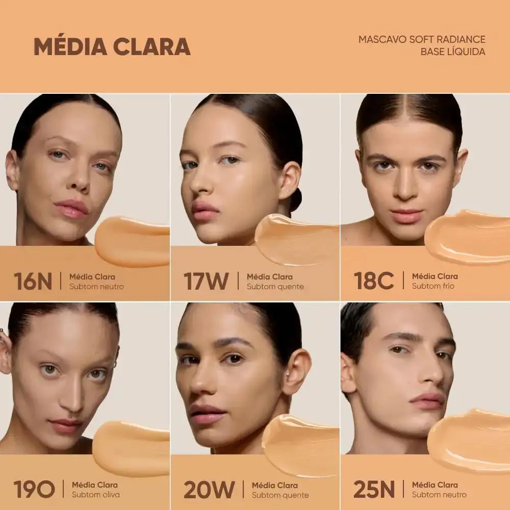 base líquida facial para todos os tipos de pele. Com textura leve e confortável a base Mascavo Soft Radiance disfarça as imperfeições com acabamento uniforme e natural.Com ingredientes hidratantes deixa um glow lindo e delicado na face. Sua fórmula de longa duração é resistente à água não transfere. Experimente e surpreenda-se com a Base Líquida Mascavo Soft Radiance 25N 30ml. Itens Inclusos: