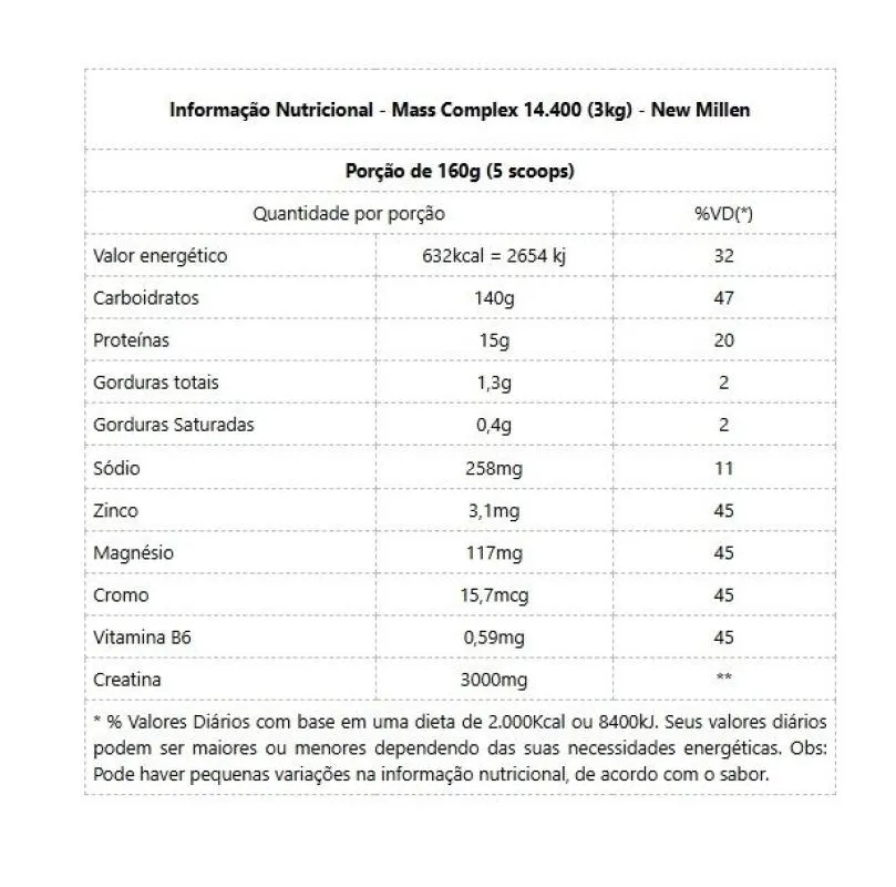 Mass Complex 14.400 (3kg) O Mass Complex 14.000 é o mais completo hipercalórico do mercado, fornecendo excelente aumento de massa muscular. Sua composição possui a combinação de 4 fontes proteicas (WPC, WPI, WPH e Albumina), carboidrato de energia rápida (Maltodextrina) e o aminoácido Creatina, fornecendo 3g na porção. Sendo um excelente aliado ao aumento de massa e explosão muscular. O Mass Complex 14.000 é um Blend completo onde as proteínas auxiliam na formação dos músculos e ossos. A vitamina B6 e o Cromo auxiliam no metabolismo de Proteínas, Carboidratos e Gorduras. Contém também o Magnésio, para o funcionamento muscular e neuromuscular. O Zinco auxilia na síntese de proteínas, manutenção de ossos, sistema imune e é um antioxidante que auxilia na proteção dos danos causados pelos radicais livres. Além disso, o blend conta com a Creatina, que auxilia no aumento do desempenho físico durante exercícios repetitivos ou de curta duração e alta intensidade. Benefícios: - Ganho de Massa, Recuperação e Força;- Composto com Proteínas de Alto Valor Biológico;- Mais de 600 Kcal por porção;- Com Creatina, ZMA e Vitamina B6;- Excelente digestão e Absorção;- Embalagem Econômica;- Não Contém Glúten.