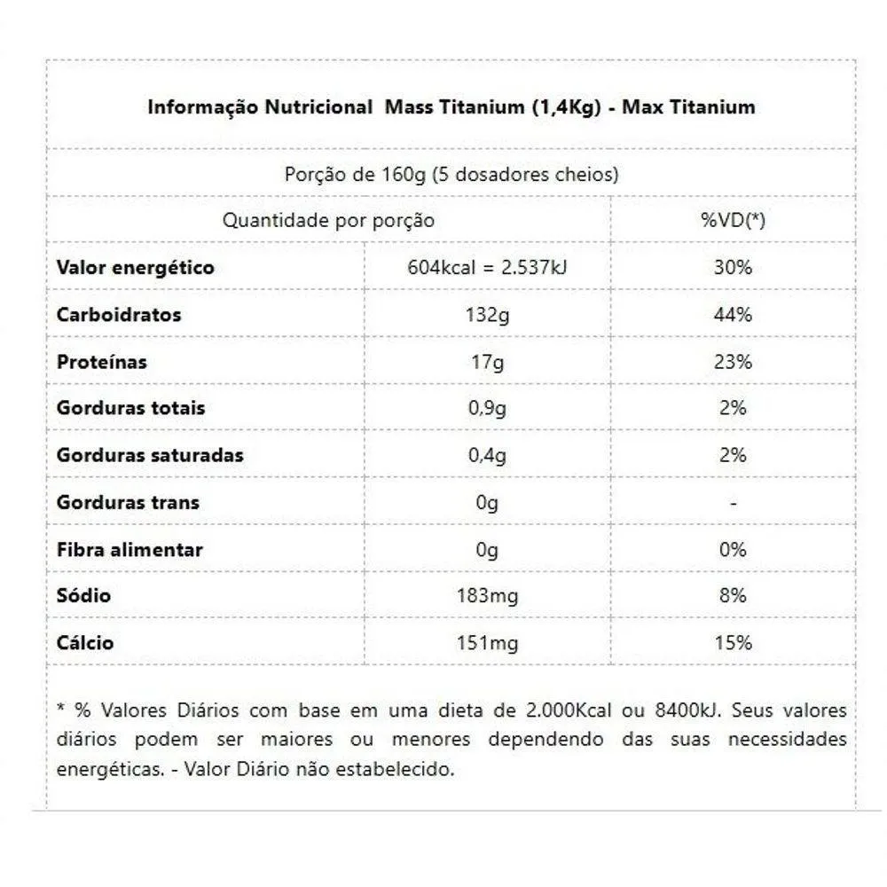 Informação Nutricional Mass Titanium (1,4Kg) - Max TitaniumPorção de 160g (5 dosadores cheios)Quantidade por porção%VD(*)Valor energético604kcal = 2.537kJ30%Carboidratos132g44%Proteínas17g23%Gorduras totais0,9g2%Gorduras saturadas0,4g2%Gorduras trans0g-Fibra alimentar0g0%Sódio183mg8%Cálcio151mg15%* % Valores Diários com base em uma dieta de 2.000Kcal ou 8400kJ. Seus valores diários podem ser maiores ou menores dependendo das suas necessidades energéticas.- Valor Diário não estabelecido.