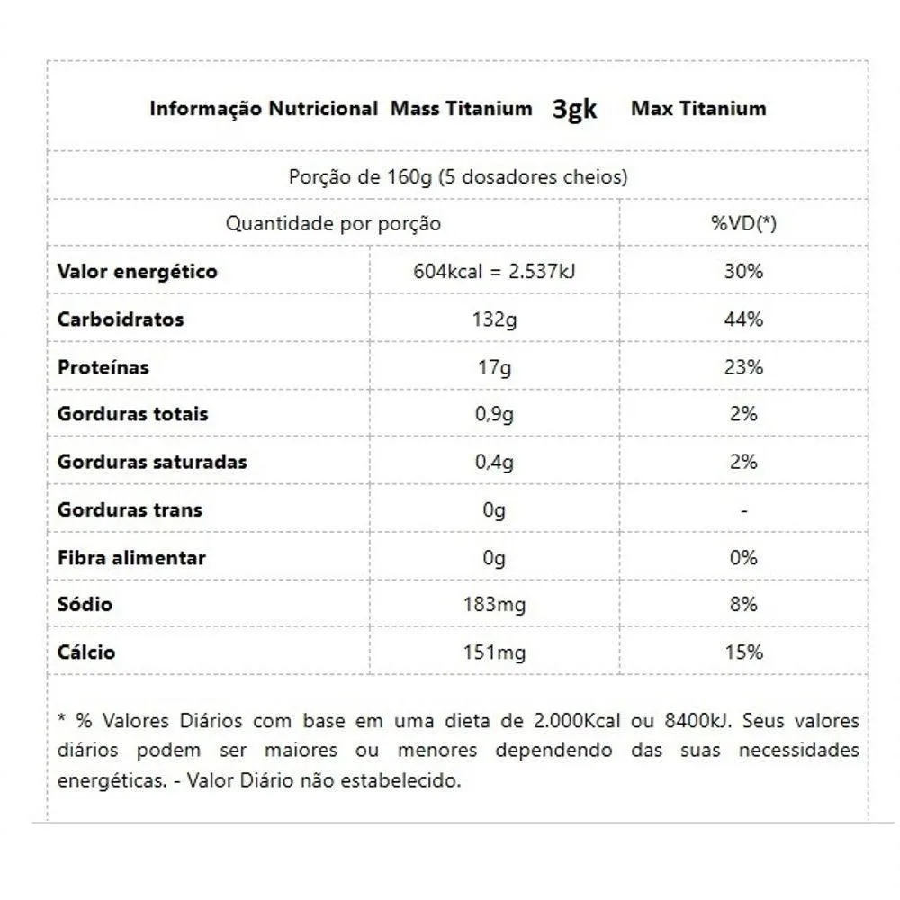 Informação Nutricional Mass Titanium (3Kg) - Max TitaniumPorção de 160g (5 dosadores cheios)Quantidade por porção%VD(*)Valor energético604kcal=2.537kJ30Carboidratos132g44Proteínas17g23Gorduras totais0,9g2Gorduras saturadas0,4g2Gorduras trans0g-Fibra alimentar0g0Sódio183mg8Cálcio151mg15* % Valores Diários com base em uma dieta de 2.000Kcal ou 8400kJ. Seus valores diários podem ser maiores ou menores dependendo das suas necessidades energéticas. Obs: Pode haver pequenas variações na informação nutricional, de acordo com o sabor. Informação Nutricional Mass Titanium (3Kg) - Max Titanium - Leite CondensadoPorção de 160g (5 dosadores cheios)Quantidade por porção%VD(*)Valor energético609kca31Carboidratos134g45Açúcares totais17g Açúcares adicionados1122Proteínas17g34Gorduras totais0,5g1Sódio294g15Cálcio101mg10* % Valores Diários com base em uma dieta de 2.000Kcal ou 8400kJ. Seus valores diários podem ser maiores ou menores dependendo das suas necessidades energéticas. Obs: Pode haver pequenas variações na informação nutricional, de acordo com o sabor. Informação Nutricional Mass Titanium (3Kg) - Max Titanium - ChocolatePorção de 160g (5 dosadores cheios)Quantidade por porção%VD(*)Valor energético610kcal31Carboidratos133g44Açúcares totais17g Açúcares adicionados11g22Proteínas17g34Gorduras totais0,9g2Gorduras saturadas0,4g2Gorduras trans0g-Fibra alimentar0g0Sódio287mg14Cálcio98mg10* % Valores Diários com base em uma dieta de 2.000Kcal ou 8400kJ. Seus valores diários podem ser maiores ou menores dependendo das suas necessidades energéticas. Obs: Pode haver pequenas variações na informação nutricional, de acordo com o sabor.