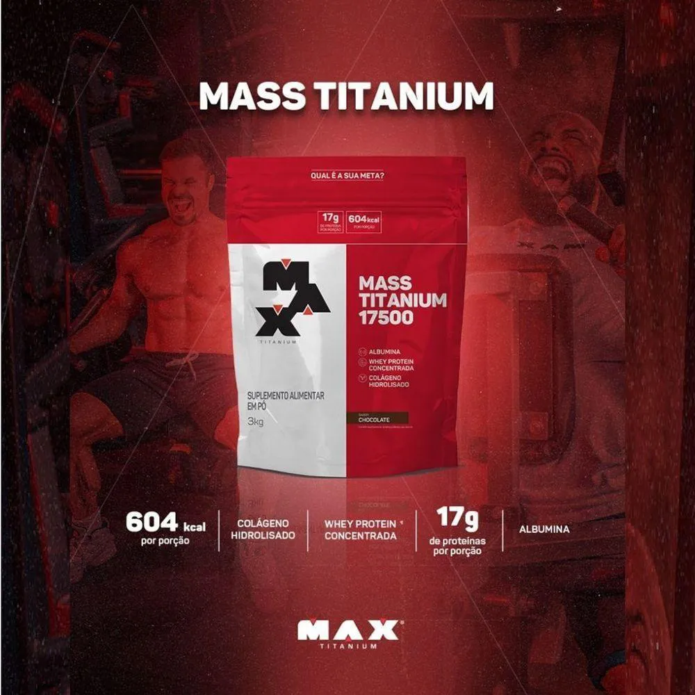 MASS TITANIUM - MAX TITANIUM Hipercalóricos são compostos por carboidratos e proteínas de alto valor biológico, vitaminas e minerais. É indicado para quem tem o metabolismo acelerado e dificuldade de ganhar massa magra. Ajuda no ganho de volume de massa muscular e peso, melhora a performance, supre necessidades de energia e auxilia na recuperação pós-treino. Apresentam composições de carboidratos e proteínas de alto valor biológico, contendo proteína concentrada do soro do leite (WPI), albumina e colágeno hidrolisado, contribui para um bom aporte calórico diário, especialmente para pessoas que tem dificuldade de ganhar peso corporal, auxilia no aumento do glicogênio muscular e sintese de glicogênio também. MASS TITANIUM contém em sua fórmula exclusiva três tipos de proteínas com alto valor biológico: Whey protein concentrada, colágeno hidrolisado e albumina do ovo. Os hipercalóricos são indicados para pessoas que têm o metabolismo muito acelerado e que querem ganhar peso. BENEFÍCIOS:* Aumento do aporte calórico;* Aumento de energia;* Recuperação de glicogênio muscular; * Aumento do peso corporal.
