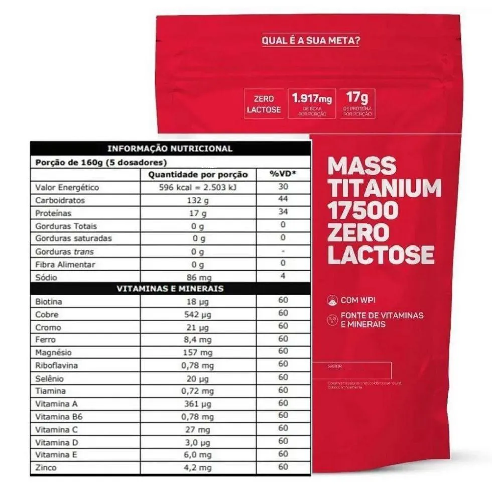 Hipercalórico completo e sem lactose! MASS TITANIUM 17500 ZERO LACTOSE combina três fontes proteicas de alta biodisponibilidade e digestibilidade e duas fontes de carboidratos. Sua fórmula conta ainda com vitaminas e minerais que contribuem para a metabolização dos macronutrientes.