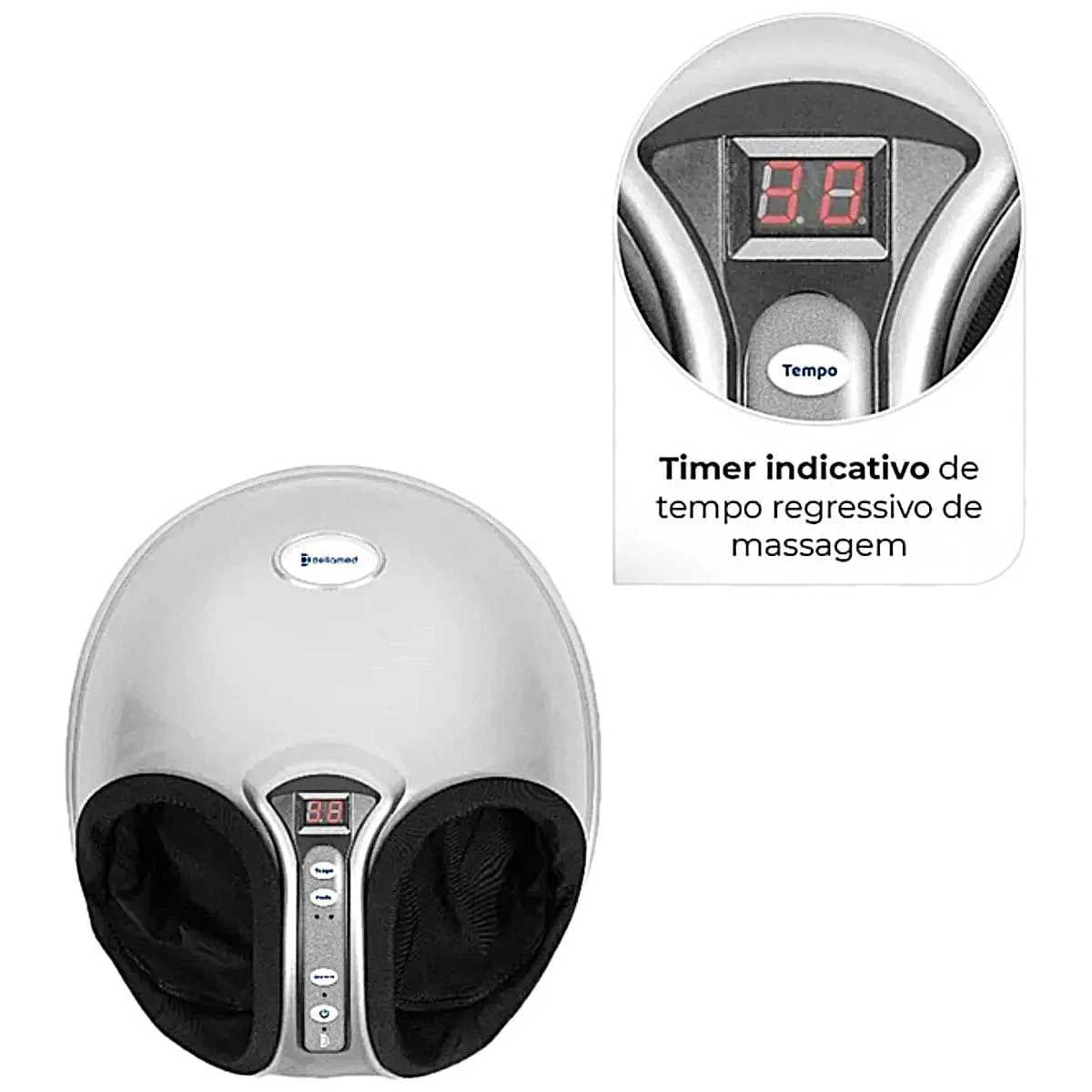 Local de massagem Massageia a palma do pé por completo e estimula circulação Composição plástico de polipropileno Cor prata Desligamento automático sim e programável Tempo de uso até 30 minutos, após desligamento automático Modos de massagem 02 Quantidade de massageador 2 massageadores por pé Com inflagem sim, que garante maior conforto e melhora da circulação sanguínea Inflagem possui função inflagem, com até 2 intensidades Capa pode ser retirada a capa onde fica os pés, para lavagem Fonte bivolt Comprimento 40 cm Largura 20 cm Altura 36 cm Peso 3,3 kg Garantia do Fabricante 12 meses de garantia (incluso 3 meses de garantia legalConteúdo da Embalagem