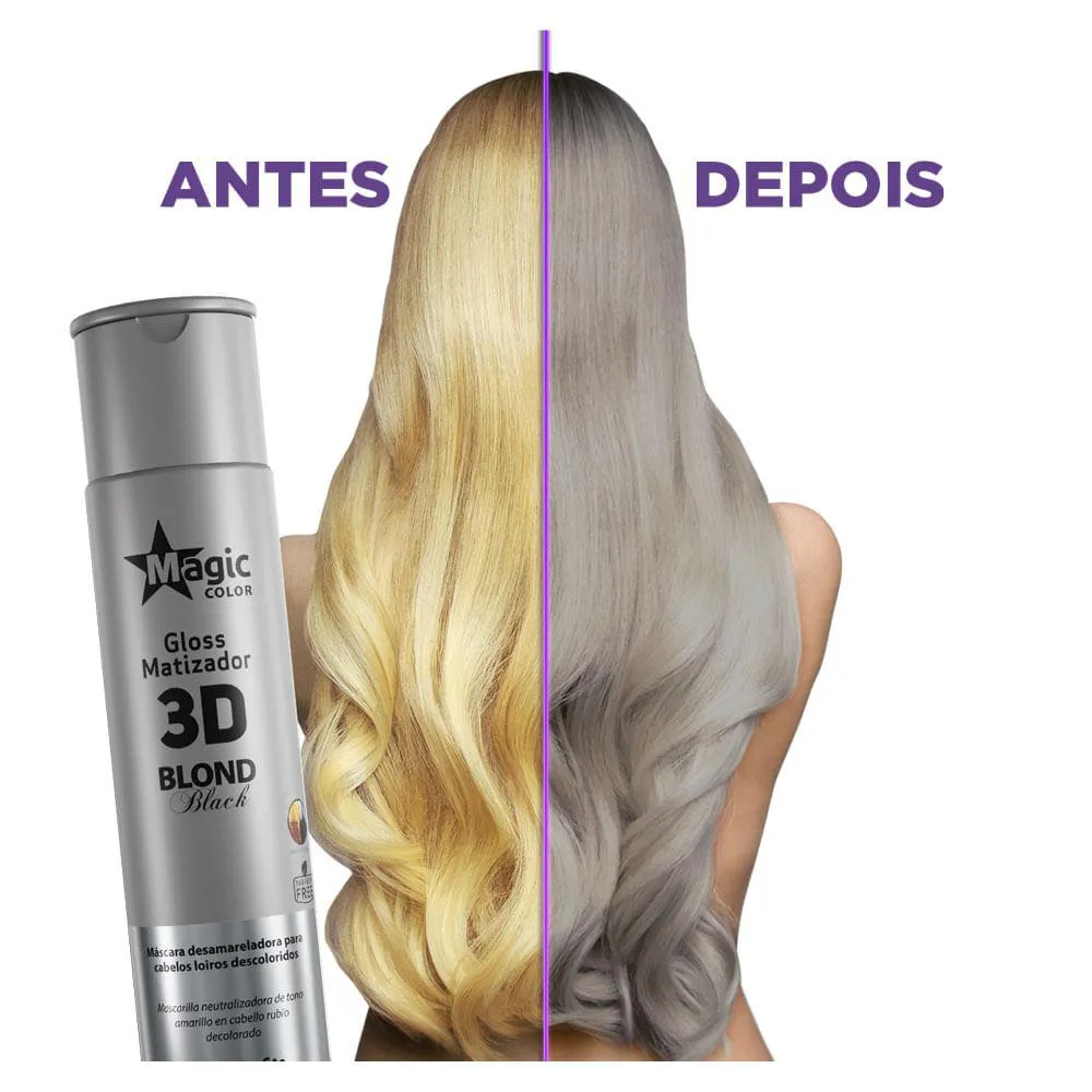 Máscara capilar para desamarelar cabelos loiros descoloridos, brancos ou grisalhos.