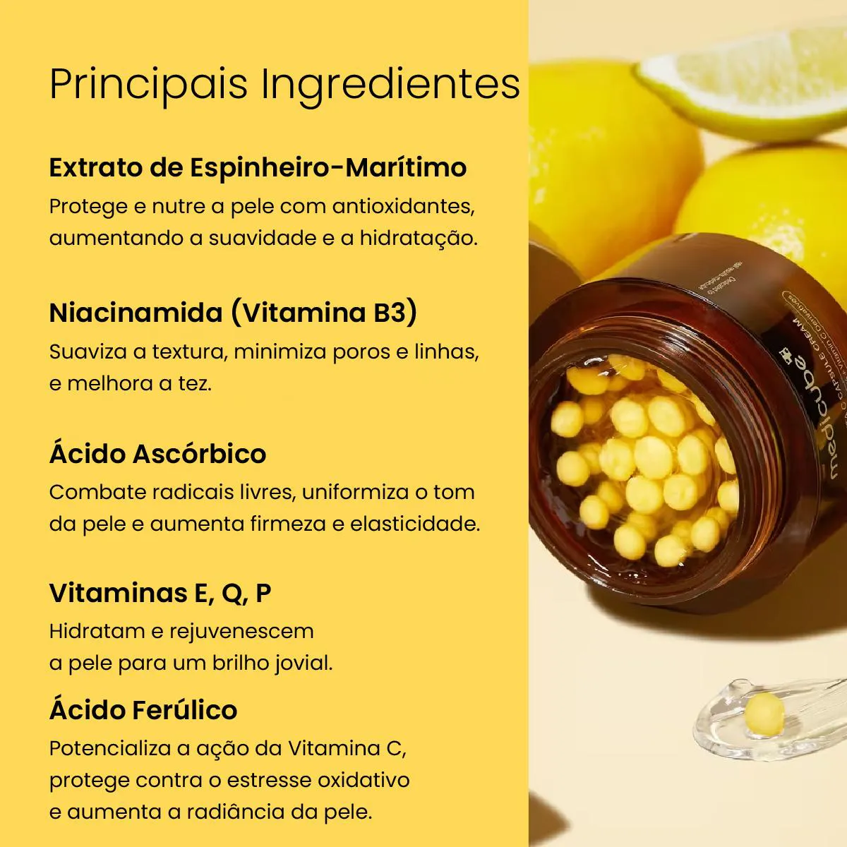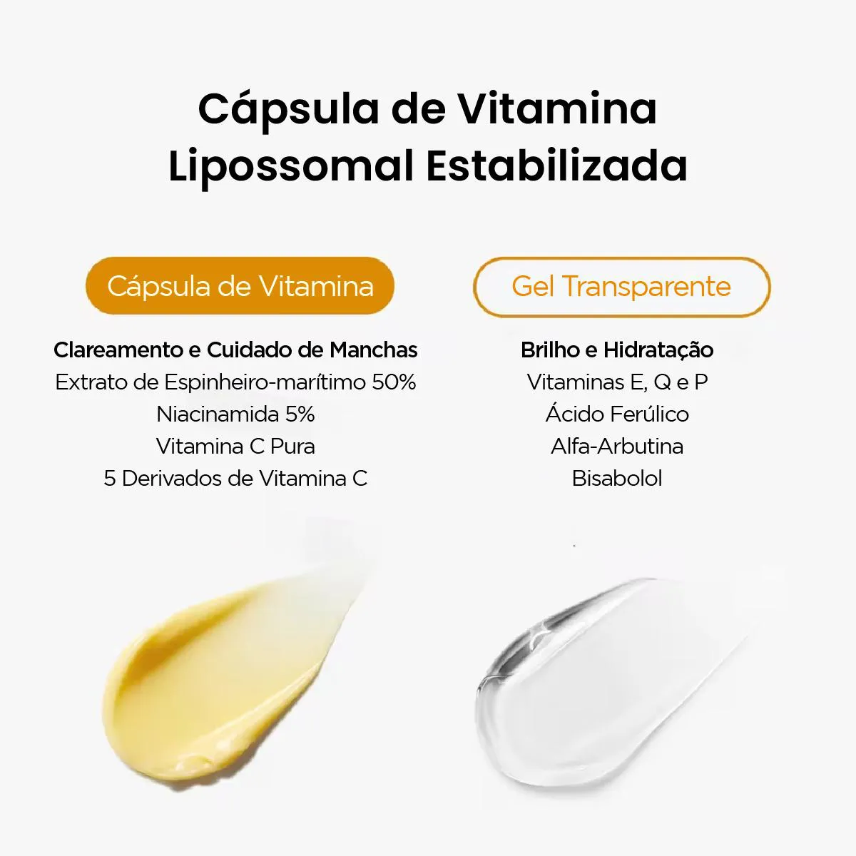 Cápsulas com vitamina C pura; 50% de extrato de espinheiro-marítimo; 5% de niacinamida; gel com ácido ferúlico, vitamina E e coenzima Q10.