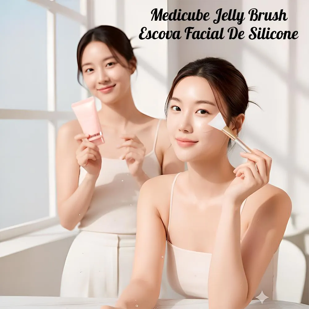 1. Limpeza suave do rosto com a escova facial de silicone Medicube Jelly Brush: ajuda a remover impurezas e resíduos de maquiagem sem agredir, ideal para rotinas de skincare diárias.