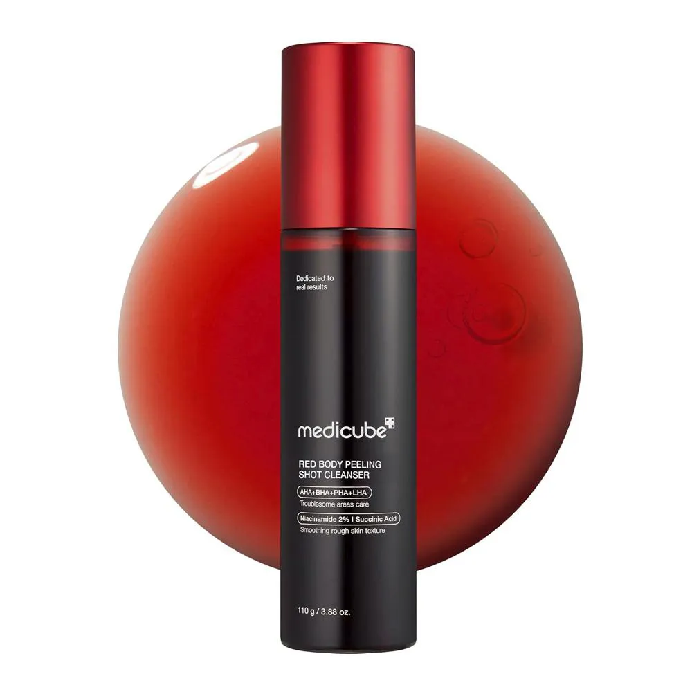 1. Medicube Red Acne Body Peeling Shot: esfoliante corporal de K-beauty para rotina de skincare do corpo, pensado para quem busca peeling corporal prático em áreas como costas, ombros e peito.