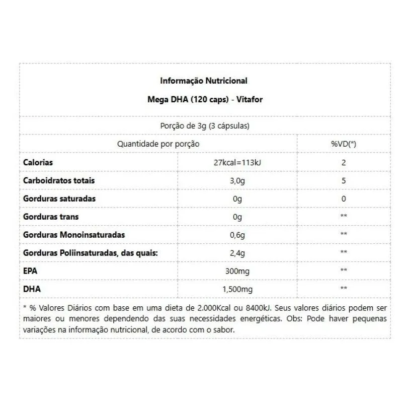 MEGA DHA (120 caps) – VITAFOR Mega DHA da Vitafor é um complemento alimentar em cápsulas a base de Ômega alta concentração 10% EPA e 50% DHA, extraído através de processo de alta tecnologia onde se isenta de impurezas e metais pesados. Sua importância é notável, uma vez que 60% do nosso cérebro é formado por gorduras, e até 20% delas corresponde ao DHA. Normalmente, os níveis de DHA diminuem com o avançar da idade, em particular na região do hipocampo (memória e navegação espacial).