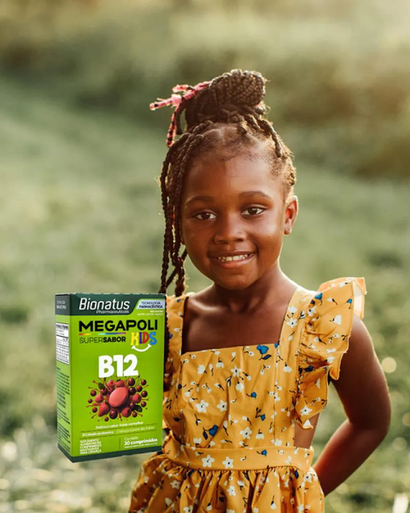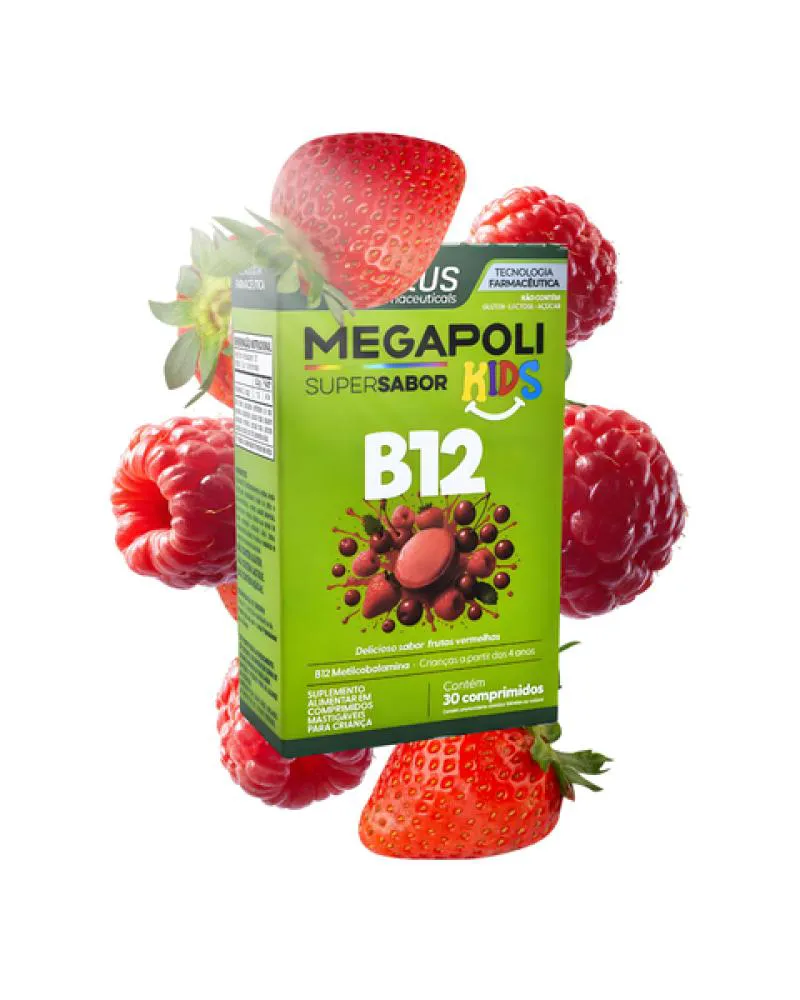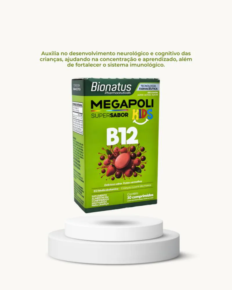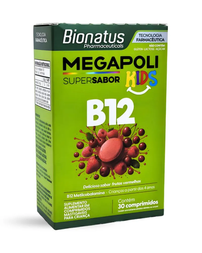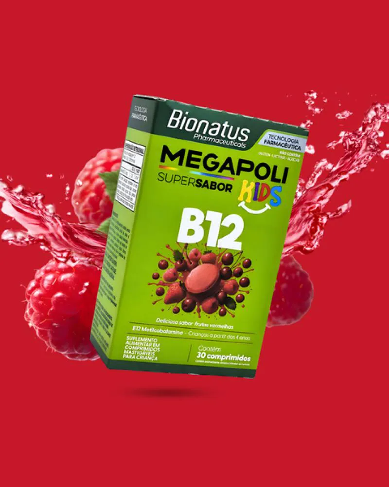 O Megapoli B12 Kids da Bionatus serve para auxiliar no desenvolvimento neurológico e cognitivo das crianças, ajudando na concentração e aprendizado, além de fortalecer o sistema imunológico, apoiar a produção de energia, a formação de células vermelhas do sangue (combatendo a fadiga) e o bom funcionamento do metabolismo, sendo um suplemento mastigável sabor frutas vermelhas, sem glúten, lactose ou açúcar, para uso diário em crianças a partir de 4 anos.