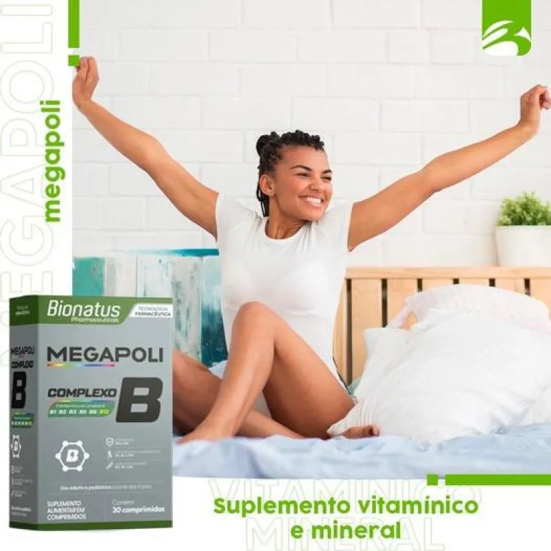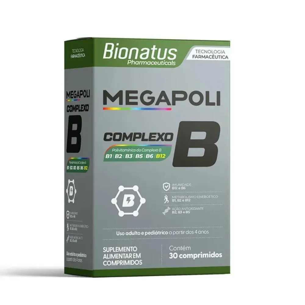Megapoli Complexo B Bionatus é um suplemento alimentar em comprimidos com vitaminas B1, B2, B3, B5, B6 e B12. Uso oral. Uso adulto e pediátrico a partir de 4 anos. Não exceder a recomendação diária de consumo indicada na embalagem. Esse produto não é medicamento. Não contém glúten.