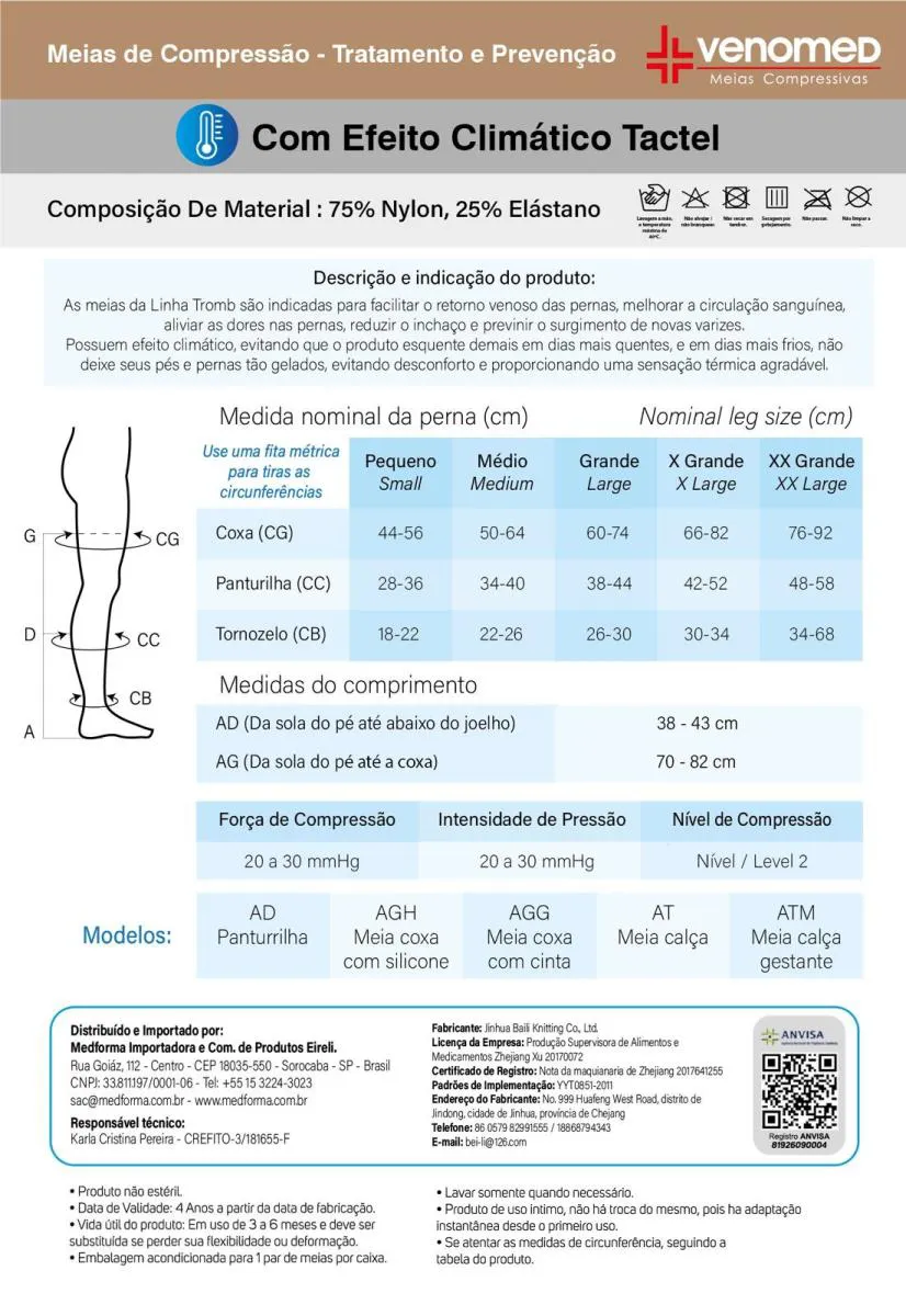 Indicações: As meias da Linha Tromb são recomendadas para facilitar o retorno venoso das pernas, melhorar a circulação sanguínea, aliviar dores nas pernas, reduzir inchaços e prevenir o surgimento de varizes, atendendo às necessidades individuais de cada paciente conforme orientação médica. Benefícios: Possuem efeito climático que regula a temperatura, proporcionando conforto térmico tanto em dias quentes quanto frios, evitando desconfortos térmicos extremos. Durabilidade: Conforme padrões internacionais de compressão, o efeito compressivo é garantido por 3 a 6 meses. Contraindicações: Não devem ser utilizadas em casos de obstrução arterial aguda, trombose venosa profunda recente, insuficiência cardíaca descompensada, entre outras. Consulte um médico para avaliação adequada. Trocas e Devoluções: Trocas são aceitas apenas em caso de defeito de fabricação, desde que a embalagem esteja lacrada. Após o uso ou experimentação, não é possível realizar trocas devido à personalização ao formato da perna e natureza íntima do produto. Observações: Fios internos garantem segurança contra furos; não corte esses fios para evitar problemas na troca. Cada par é rigorosamente inspecionado para garantir a compressão ideal. Garantia do Produto: Mantenha a embalagem original com etiqueta de código de barras para garantir informações detalhadas do produto em caso de troca. Use uma fita para medir tornozelo, panturrilha e coxa para escolher o tamanho correto da meia. REGISTRO ANVISA 81926090004