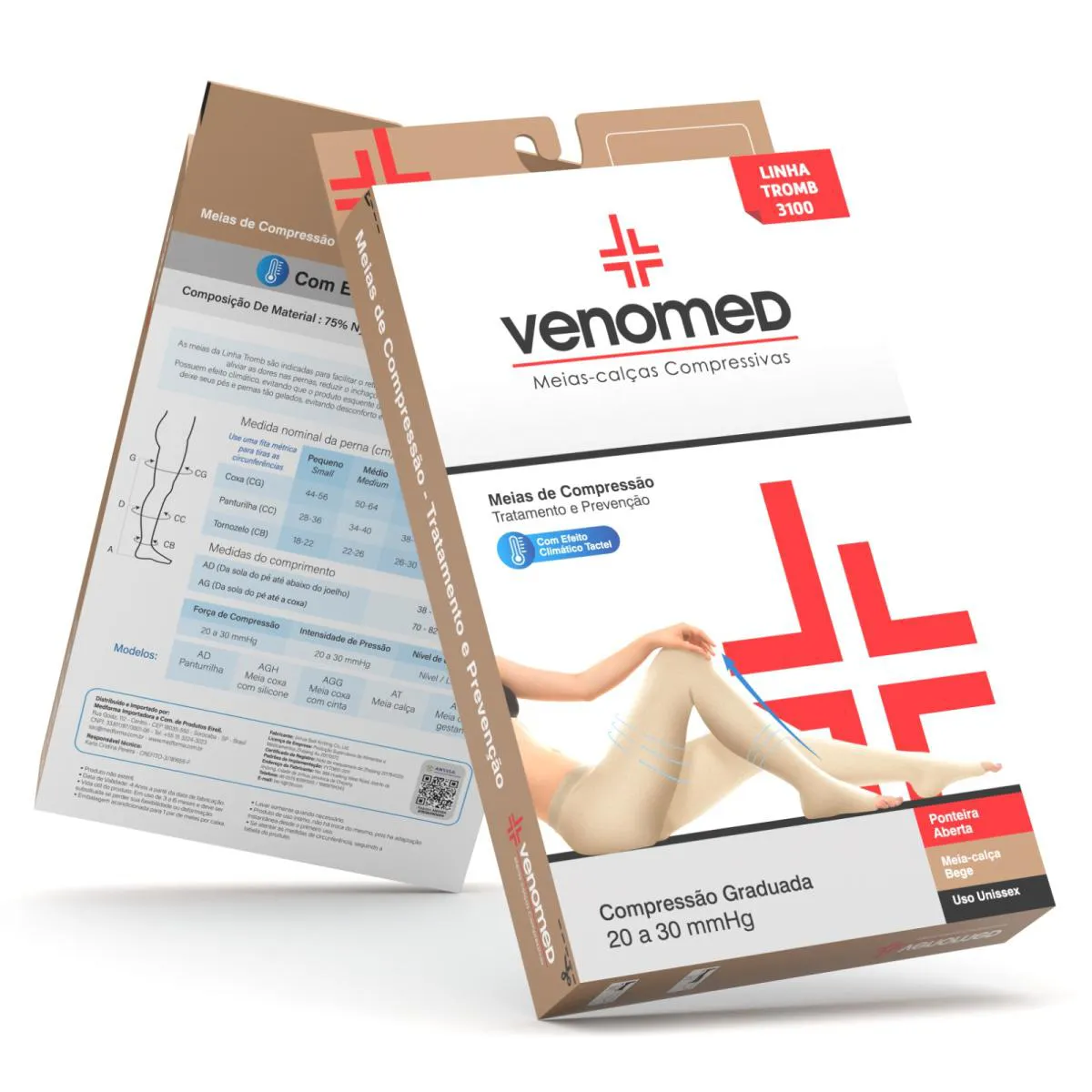 INFORMAÇÕES AO USUÁRIO: INFORMAÇÕES COMPLETAS NA PARTE INTERNA DA EMBALAGEM. USAR FITA PARA MEDIR: TORNOZELO - PANTURRILHA - COXA. As meias da Linha Tromb facilitam o retorno venoso das pernas, melhoram a circulação sanguínea, aliviam dores, reduzem inchaço e previnem varizes, conforme indicação médica. Oferecem efeito climático, evitando calor excessivo em dias quentes e frio em dias frios, proporcionando conforto térmico. DURABILIDADE: O efeito compressivo é garantido por 3 a 6 meses, segundo padrões internacionais. A durabilidade física varia com os cuidados de conservação e manuseio do paciente. CONTRAINDICAÇÕES: - Obstrução arterial aguda - Perturbações graves de circulação arterial - Trombose venosa profunda recente - Insuficiência cardíaca descompensada - Edemas de origem metabólica - Microangiopatia diabética - diabetes mellitus com complicações - Hipodermites agudas - Dermatoses exsudativas e fúngicas - Insuficiência renal grave A responsabilidade é recusada em caso de não observância das contraindicações e orientações médicas. TROCAS E DEVOLUÇÕES: meias de compressão não podem ser trocadas após uso, exceto por defeito de fabricação. Troca por arrependimento ou compra errada só é permitida com a embalagem fechada e lacrada, pois as meias se moldam ao usuário e são de uso íntimo. OBSERVAÇÕES: Seguem presentes segmentos de fios na parte interna da meia para evitar furos e desmalhamentos. Não corte os fios, pois isso inviabiliza trocas. Pequenas variações entre lotes ou no mesmo par não comprometem a compressão. INSPEÇÃO FINAL: 100% das meias são revisadas no processo de inspeção final. A Venomed não aceita devolução por fio puxado. GARANTIA: Guarde a embalagem com a etiqueta de código de barras, essencial para trocas e informações detalhadas do produto.
