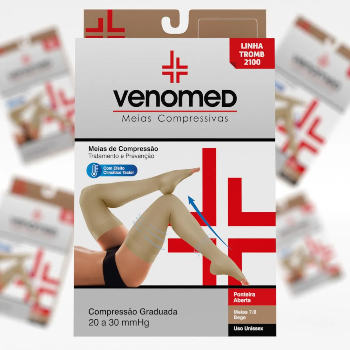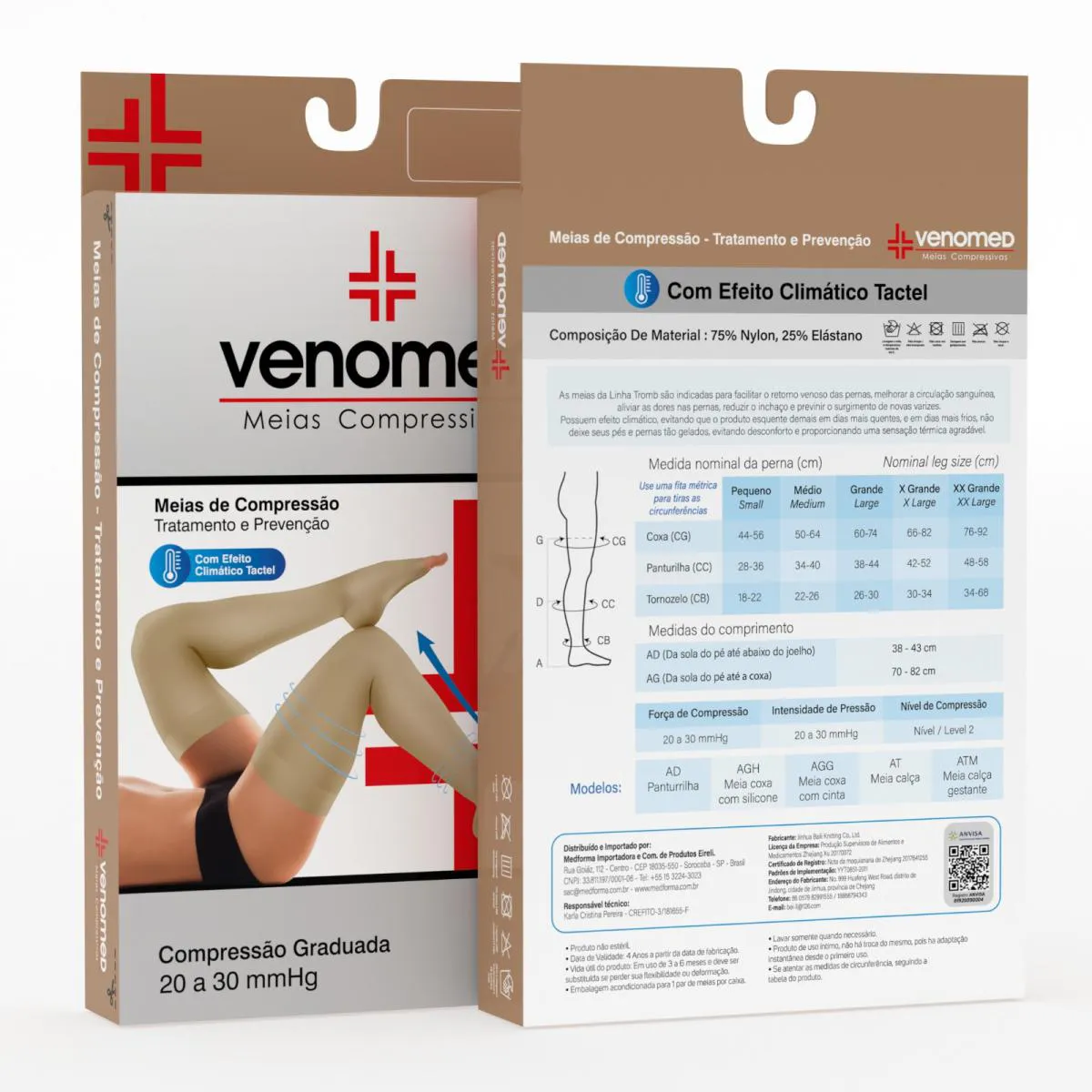INFORMAÇÕES AO USUÁRIO: INFORMAÇÕES COMPLETAS NA PARTE INTERNA DA EMBALAGEM. USAR FITA PARA MEDIR: TORNOZELO - PANTURRILHA - COXA. As meias da Linha Tromb facilitam o retorno venoso das pernas, melhoram a circulação sanguínea, aliviam dores, reduzem inchaço e previnem varizes, conforme indicação médica. Oferecem efeito climático, evitando calor excessivo em dias quentes e frio em dias frios, proporcionando conforto térmico. DURABILIDADE: O efeito compressivo é garantido por 3 a 6 meses, segundo padrões internacionais. A durabilidade física varia com os cuidados de conservação e manuseio do paciente. CONTRAINDICAÇÕES: - Obstrução arterial aguda - Perturbações graves de circulação arterial - Trombose venosa profunda recente - Insuficiência cardíaca descompensada - Edemas de origem metabólica - Microangiopatia diabética - diabetes mellitus com complicações - Hipodermites agudas - Dermatoses exsudativas e fúngicas - Insuficiência renal grave A responsabilidade é recusada em caso de não observância das contraindicações e orientações médicas. TROCAS E DEVOLUÇÕES: meias de compressão não podem ser trocadas após uso, exceto por defeito de fabricação. Troca por arrependimento ou compra errada só é permitida com a embalagem fechada e lacrada, pois as meias se moldam ao usuário e são de uso íntimo. OBSERVAÇÕES: Seguem presentes segmentos de fios na parte interna da meia para evitar furos e desmalhamentos. Não corte os fios, pois isso inviabiliza trocas. Pequenas variações entre lotes ou no mesmo par não comprometem a compressão. INSPEÇÃO FINAL: 100% das meias são revisadas no processo de inspeção final. A Venomed não aceita devolução por fio puxado. GARANTIA: Guarde a embalagem com a etiqueta de código de barras, essencial para trocas e informações detalhadas do produto.