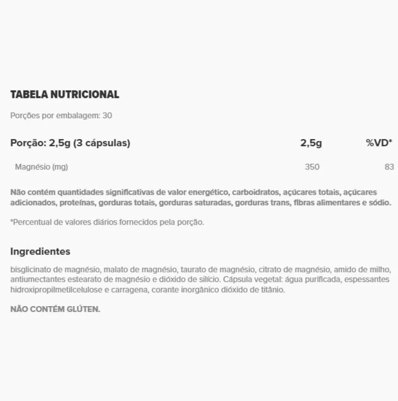 Mg Complex (90 Caps) O [Mg] COMPLEX é um blend em cápsulas que oferece quatro diferentes fontes de magnésio (bisglicinato, malato, taurato e citrato) com excelente biodisponibilidade, tornando mais abrangente o seu aproveitamento no organismo. PARA UMA VIDA COM EQUILÍBRIO E VITALIDADE O magnésio é considerado o rei dos minerais, e esse título refere-se às importantes funções que ele desempenha no organismo. O magnésio está presente em mais de 300 reações fisiológicas, sendo essencial para a regulação e o equilíbrio do corpo. O MINERAL QUE IMPULSIONA SUA saúde - Formação de ossos e dente;- Metabolismo energético;- Metabolismo de proteínas, carboidratos e gorduras;- Equilíbrio dos eletrólitos- Divisão celular;- Funcionamento muscular e neuromuscular. BLEND DE MAGNÉSIO PARA ALTA ABSORÇÃO E APROVEITAMENTO [Mg] Complex foi minuciosamente desenvolvido através de uma extensa e cuidadosa pesquisa, visando a sua melhor absorção e utilização pelo corpo! Sua fórmula possui o protagonismo de quatro fontes orgânicas e altamente biodisponíveis de magnésio em sinergia: bisglicinato, malato, taurato e citrato. Cada tipo de magnésio apresenta uma afinidade especial com diferentes tecidos do corpo, garantindo um aproveitamento superior pelo organismo. BISGLICINATO DE MAGNÉSIO - Estrutura estável que promove os benefícios do magnésio por todo o corpo.O bisglicinato de magnésio, também conhecido como magnésio quelado, é uma verdadeira estrela na suplementação de magnésio. Aqui, o magnésio está ligado a duas moléculas do aminoácido glicina, garantindo proteção contra reações no trato digestivo e facilitando a absorção pelo corpo. MALATO DE MAGNÉSIO - Aliado ao funcionamento muscular. O malato de magnésio combina magnésio com ácido málico, um composto essencial para a produção de ATP - a principal molécula de energia do nosso corpo -, que acontece dentro das mitocôndrias. Essa combinação é interessante para quem precisa de um impulso extra para ter mais energia, como atletas e indivíduos com fadiga. TAURATO DE MAGNÉSIO oferece suporte ao funcionamento neuromuscular. O taurato de magnésio é uma poderosa combinação de magnésio e taurina. Essa estrutura única apresenta uma maior permeabilidade em determinados tecidos, como a barreira hematoencefálica, facilitando a oferta de magnésio ao cérebro, órgão que utiliza esse mineral em diversas reações. A taurina, por sua vez, é encontrada em grandes quantidades no cérebro, coração e músculos. CITRATO DE MAGNÉSIO -rápida absorção pelas células intestinais. O citrato de magnésio é a união perfeita entre magnésio e ácido cítrico, garantindo excelente solubilidade, independentemente do pH do estômago. A acidez estomacal é crucial para a absorção adequada do magnésio dos alimentos, mas o citrato de magnésio supera essa limitação, proporcionando ótima absorção e alta biodisponibilidade. PORQUE SUPLEMENTAR - O uso crescente de fertilizantes e aditivos agrícolas está associado ao empobrecimento do solo, o que compromete a qualidade nutricional dos alimentos e, como consequência, limita a oferta de magnésio e de outros nutrientes através da alimentação.- O aumento do consumo de alimentos industrializados aliado à redução do consumo de alimentos in natura dificulta a ingestão de quantidades ideais de magnésio para suprir as demandas do organismo.- Algumas pessoas podem apresentar uma menor capacidade de absorção do magnésio devido a condições clínicas, como problemas gastrointestinais, que comprometem a capacidade do corpo de aproveitar adequadamente o mineral.- Durante exercícios físicos de longa duração, é comum que haja a perda de eletrólitos através da transpiração, entre eles o magnésio. Dessa forma, pode ser necessária sua reposição diária. Benefícios: - Formação de ossos e dentes;- Metabolismo energético, de proteínas, carboidratos e gorduras;- Equilíbrio dos eletrólitos;- Divisão celular;- Funcionamento muscular e neuromuscular.
