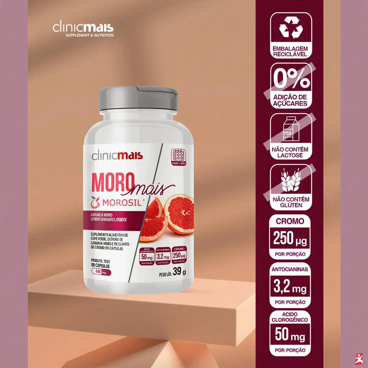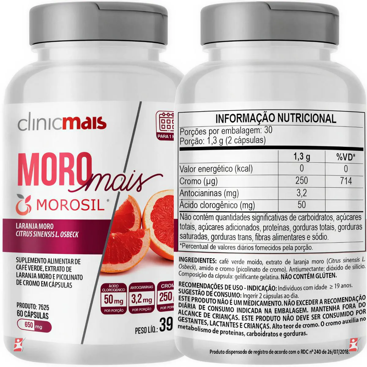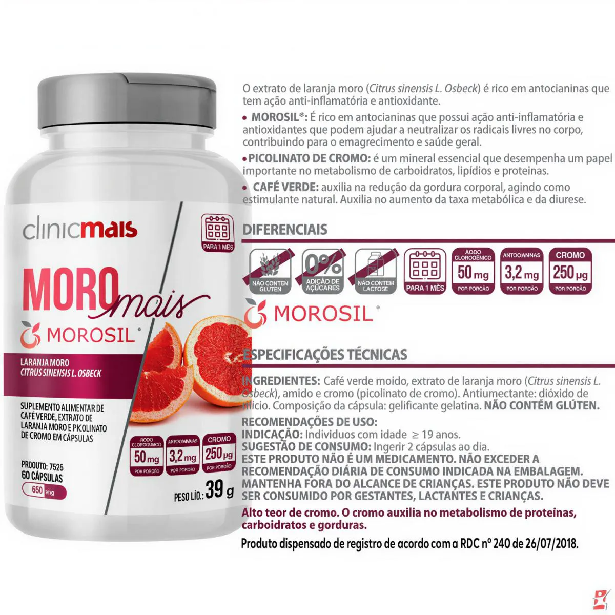 MORO MAIS MOROSIL LARANJA MORO + CAFÉ VERDE + PICOLINATO DE CROMO 60 CAPSULAS - CLINICMAIS DESCRIÇÃO Moro Mais é um suplemento alimentar em cápsulas que reúne três ingredientes funcionais de destaque: Café Verde, Cromo e Morosil®, um extrato exclusivo da laranja moro (Citrus sinensis L. Osbeck) e marca registrada da Bionap Srl, distribuído pela Galena® no Brasil, garantindo sua origem, qualidade e rastreabilidade. Sua fórmula foi pensada para auxiliar pessoas que buscam equilíbrio metabólico e uma rotina mais saudável, por meio da união de ativos reconhecidos por suas propriedades antioxidantes e sua atuação no metabolismo energético. INGREDIENTES - Café Verde: Rico em ácido clorogênico, o café verde é conhecido por sua ação antioxidante e por auxiliar no metabolismo da glicose e das gorduras, contribuindo para o equilíbrio metabólico. - Morosil® (Laranja Moro): Extrato padronizado da laranja moro, cultivada na Sicília, rica em antocianinas e polifenóis. Possui ação antioxidante potente e é estudado por seu potencial de auxiliar na redução da gordura abdominal. - Cromo (Picolinato de Cromo): Mineral essencial que participa do metabolismo de carboidratos, gorduras e proteínas. Pode contribuir para o controle da glicemia e auxiliar na sensação de saciedade. O QUE É MOROSIL®? Morosil® é um extrato do suco da laranja vermelha Moro (Citrus sinensis (L.) Osbeck), cultivada exclusivamente na região do vulcão Et-na, na Sicília (Itália). Essa laranja se diferencia pela coloração vermelha, rica em antocianinas — antioxidantes potentes não encontrados em outras frutas cítricas. Também apresenta maior teor de vitamina c e compostos fenólicos em comparação às laranjas amarelas. Seus principais compostos bioativos são: antocianinas, flavonoides, ácido ascórbico e ácidos hidroxicinâmicos, que possuem propriedades antioxidantes e podem auxiliar na redução de gordura corporal, no controle do peso e em condições relacionadas à saúde metabólica. Fonte: Galena O MORO MAIS POSSUI CONTRAINDICAÇÕES? Sim. Indicado para indivíduos com idade ≥ 19 anos. Este produto não deve ser consumido por gestantes, lactantes e crianças. Se você tem alguma condição de saúde específica ou faz uso de medicamentos, consulte um profissional de saúde antes de iniciar o consumo. O MORO MAIS É VEGANO? Não. A cápsula utiliza gelatina de origem animal, o que torna o produto não vegano. QUAL A FORMA CORRETA DE USO DO MORO MAIS? - Sugestão de consumo: ingerir 2 cápsulas ao dia. - Horário de consumo: ingeri-lo durante uma refeição pode auxiliar na absorção dos nutrientes e minimizar possíveis desconfortos gastrointestinais. CONSCIENTIZAÇÃO DE USO DO SUPLEMENTO: A suplementação precisa estar aliada à uma rotina de hábitos saudáveis, com alimentação balanceada, exercícios físicos e hidratação correta. Assim como os alimentos, a suplementação precisa de constância para que o corpo receba e utilize os nutrientes de forma eficaz. O uso regular de Moro Mais, aliado a uma alimentação equilibrada, pode potencializar os benefícios dos ingredientes presentes na fórmula. DICAS PARA POTENCIALIZAR RESULTADOS: - Mantenha uma alimentação rica em frutas, verduras e proteínas de qualidade. - Pratique exercícios físicos regulares para estimular o metabolismo. - Avalie, junto a um profissional, seus níveis de vitaminas e minerais para um ajuste mais preciso da suplementação. - Beba bastante água para auxiliar os processos metabólicos. O MORO MAIS É REGULAMENTADO PELA ANVISA? Sim. De acordo com a RDC nº 240/2018, o produto é isento de registro e segue as normas estabelecidas pela ANVISA. RECOMENDAÇÕES E CUIDADOS “ESTE PRODUTO NÃO É UM MEDICAMENTO. NÃO EXCEDER A RECOMENDAÇÃO DIÁRIA DE CONSUMO INDICADA NA EMBALAGEM. MANTENHA FORA DO ALCANCE DE CRIANÇAS. ESTE PRODUTO NÃO DEVE SER CONSUMIDO POR GESTANTES, LACTANTES E CRIANÇAS.”