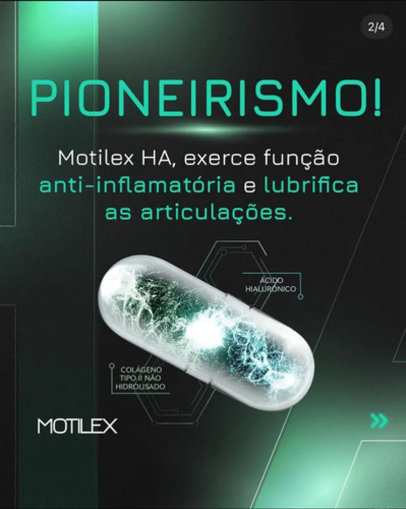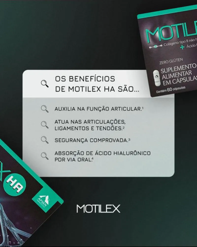 Motilex HA é um suplemento alimentar em cápsulas, desenvolvido pela Apsen, que combina colágeno Tipo II não hidrolisado com Ácido Hialurônico.Sua formulação foi criada para auxiliar na rotina de pacientes que já apresentam queixas frequentes nas articulações, especialmente quadros iniciais relacionados ao processo inflamatório articular.Ideal para quem busca suporte nutricional complementar para articulações, mobilidade e bem-estar no dia a dia.