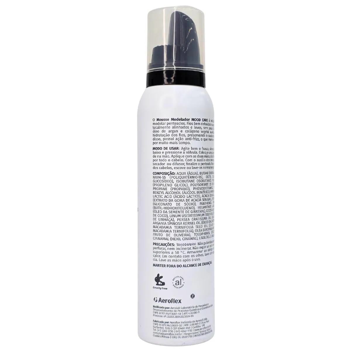 Finalidade: O Mousse Modelador MOOD CARE é indicado para fixar e modelar penteados. Fios bem definidos e cachos preservados, totalmente alinhados e leves, sem pesar. Sua fórmula com óleo de argan e colágeno vegetal auxilia na nutrição e hidratação dos fios, preservando a saude dos cabelos. Além disso, possui ação anti-frizz, o que mantém o seu penteado por muito mais tempo.