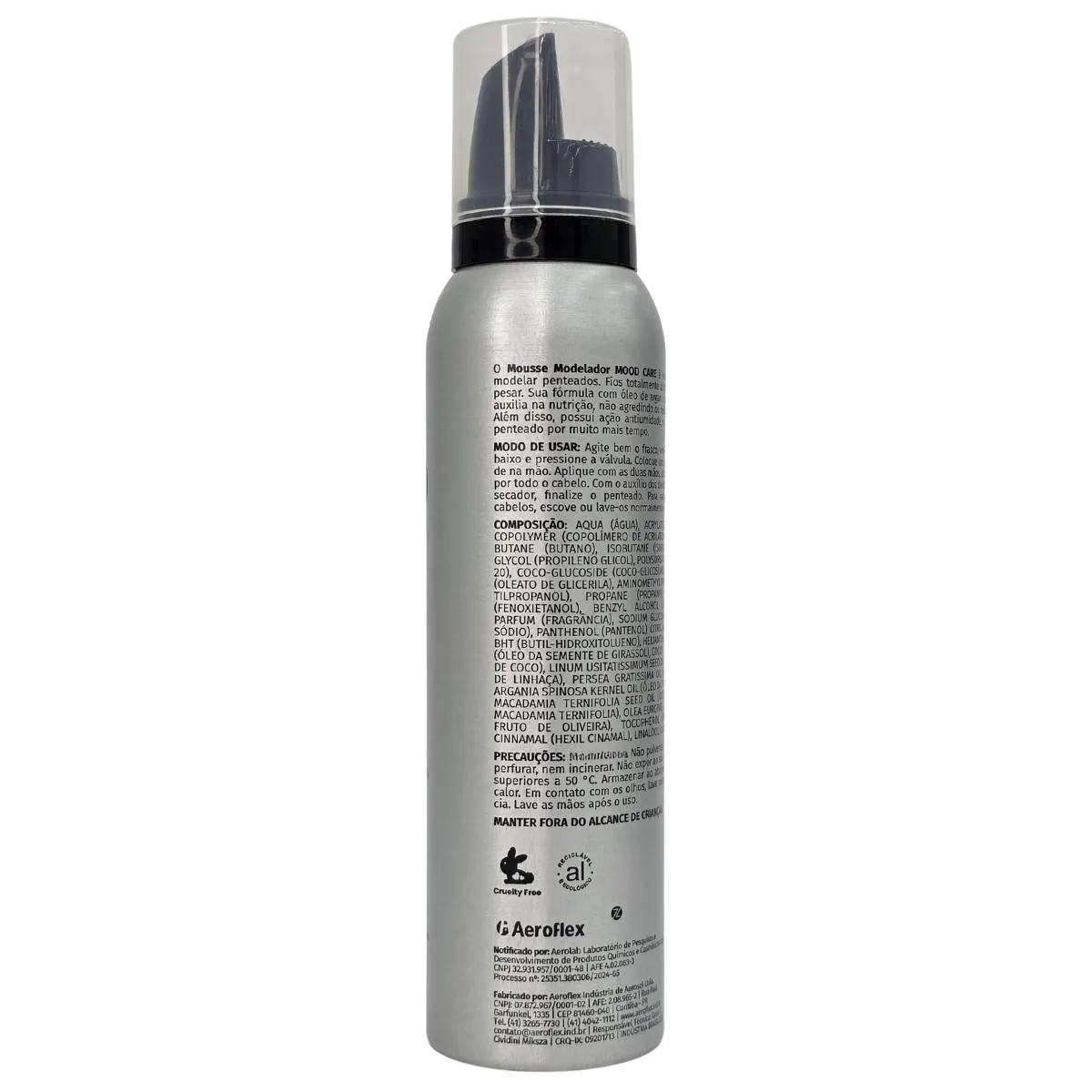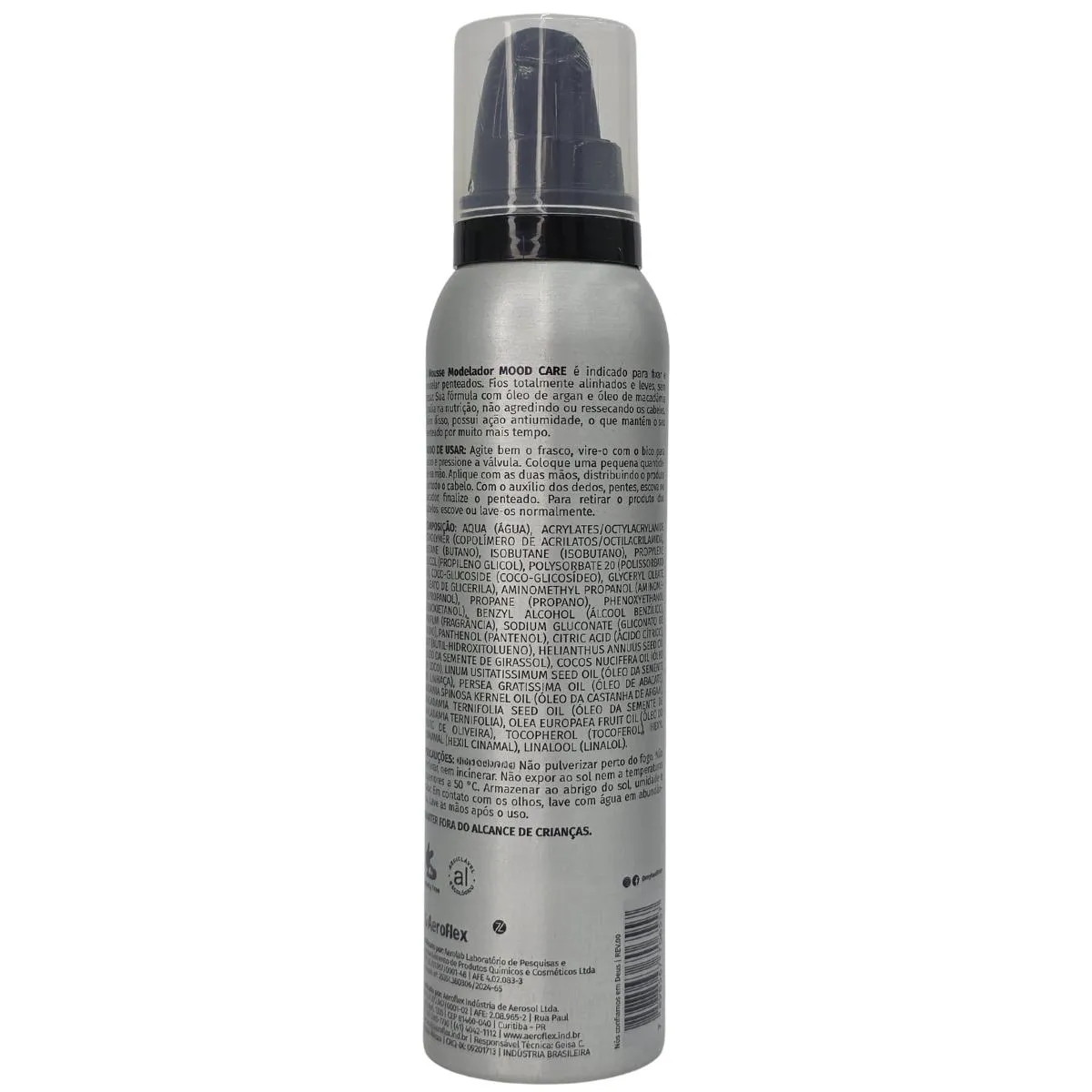 Finalidade: O Mousse Modelador Mood Care é indicado para fixar e modelar penteados. Fios totalmente alinhados e leves, sem pesar. Sua fórmula com óleo de argan e óleo de macadâmia auxilia na nutrição, não agredindo ou ressecando os cabelos. Além disso, possui ação antiumidade, o que mantém o seu penteado por muito mais tempo.