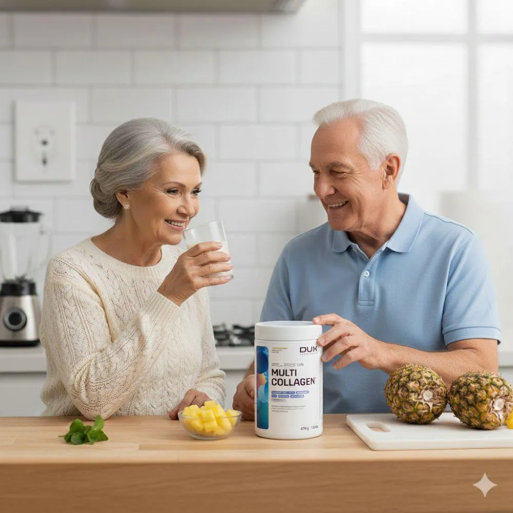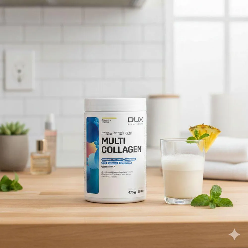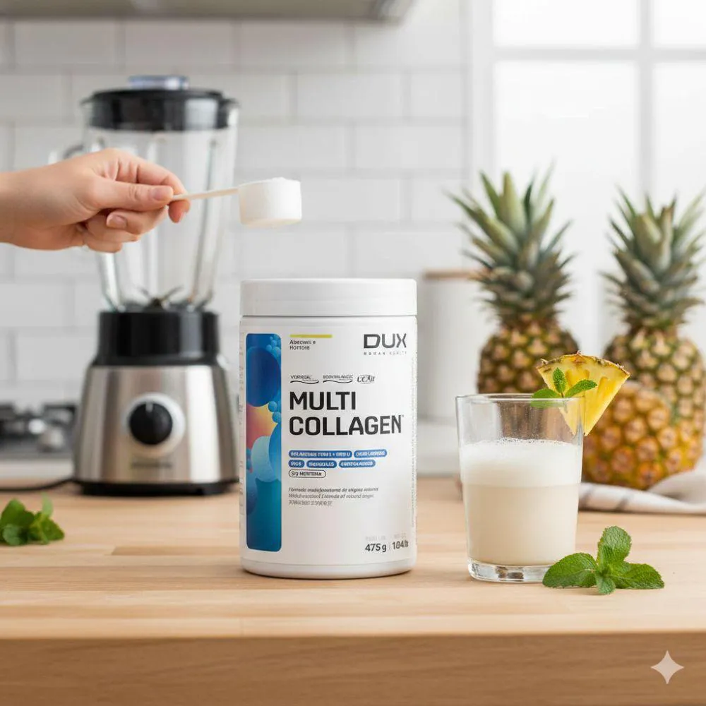 O Multi Collagen DUX é um suplemento alimentar de alta qualidade formulado para fornecer suporte completo, atuando simultaneamente no corpo. Sua composição combina colágeno tipo 1 e tipo 2 com ativos patenteados reconhecidos internacionalmente, proporcionando uma abordagem moderna e eficiente para quem busca resultados consistentes. A presença do VERISOL® contribui para a melhora da firmeza e elasticidade da pele, auxiliando na redução de sinais da idade. Já o BODYBALANCE® atua no suporte à composição corporal, favorecendo a manutenção e o desenvolvimento de massa, especialmente quando associado à prática de exercícios físicos. Além disso, o UC-II® (colágeno tipo 2) oferece suporte específico para a saúde, ajudando na mobilidade e no conforto durante as atividades do dia a dia. Cada dose fornece 16g de proteína, contribuindo para a recuperação e fornecendo aminoácidos importantes para o corpo.