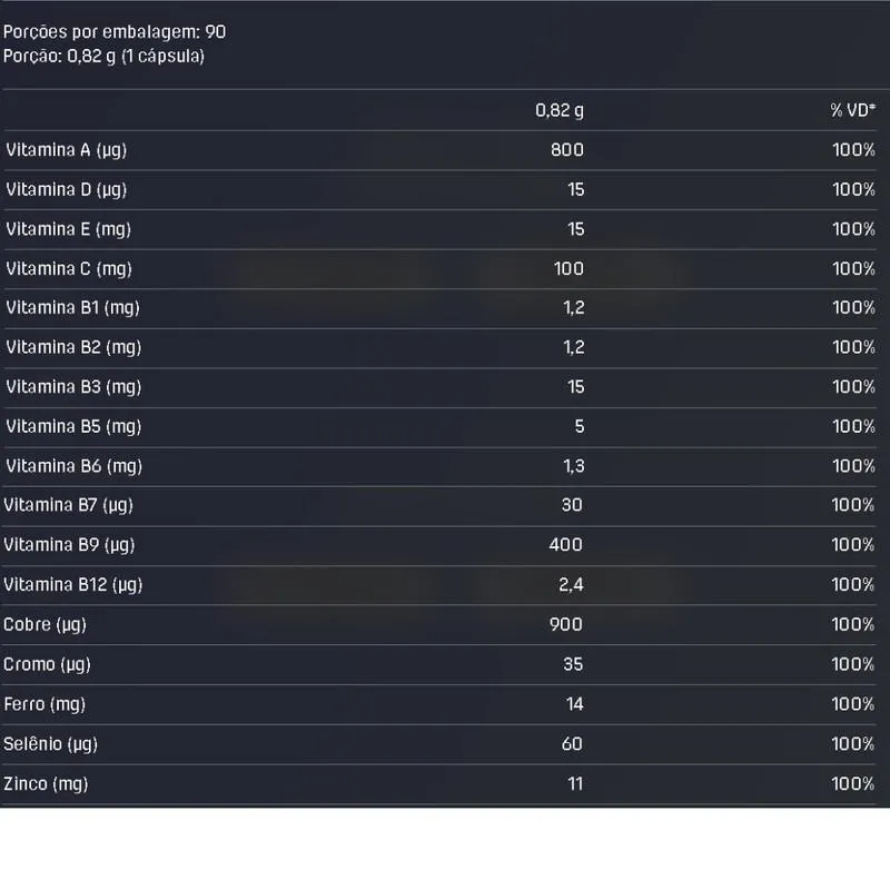 vitamina c (ascorbato de cálcio) vitamina B3 (niacinamida), vitamina e (DL-alfa tocoferol), óxido de zinco, sulfato ferroso, vitamina B5 (pantotenato de cálcio), vitamina B2 (riboflavina), vitamina B6 (cloridrato de pirodoxina), vitamina B1 (mononitrato de tiamina), sulfato de cobre, vitamina a (acetato de retinol), picolinato de cromo, vitamina B9 (ácido fólico), selenito de sódio, vitamina B7 (D-biotina), vitamina D3 (colecalciferol), vitamina B12(cianocobalamina). Composição da cápsula: Agente carreador óleo de linhaça,gelificante gelatina, água, emulsificante lecitina de girassol, umectante glicerina,glaceante cera de abelha, edulcorante sorbitol e corante óxido de ferro preto. Informação nutricional Porção de 0,76g (1 cápsula) *** Quantidade por porção %VD * Valor energético 0kcal= 0kj 0% Vitamina A 600 mcg 100% Vitamina C 45 mg 100% vitamina d 10 mg 100% Vitamina E 5 mcg 100% Vitamina B1 1,2 mg 100% Vitamina B2 1,3 mg 100% Niacina 16 mg 100% Ác. Pantotên