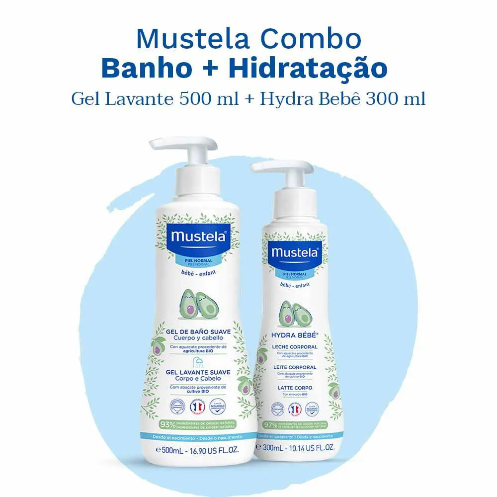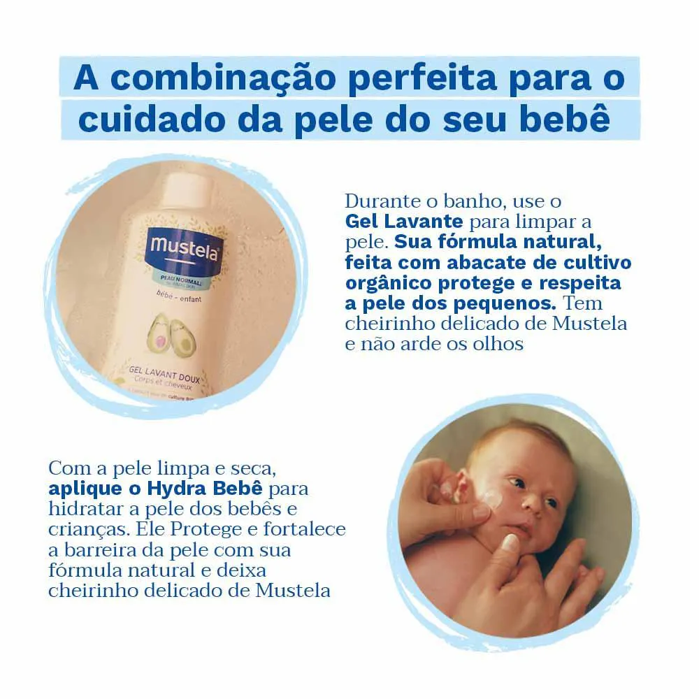 O Kit contém um Gel Lavante Mustela Corpo e Cabelo e um Hidratante Corporal Mustela Bebê, ambos desenvolvidos com expertise de 60 anos em pesquisa dermatológica, na França, e recomendados por pediatras e dermatologistas.