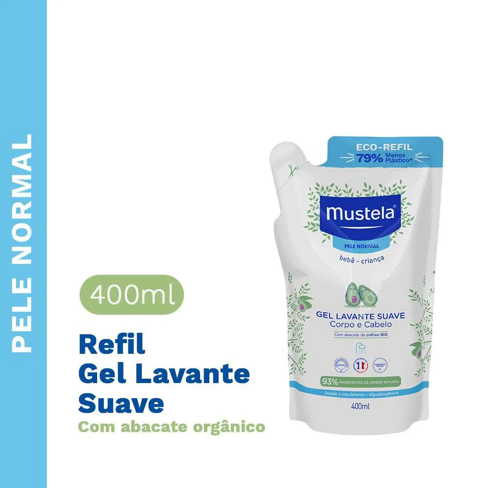 O queridinho Gel Lavante Mustela agora está disponível em embalagem Refil 400ml, com redução de 79% de plástico comparada à embalagem pump de 500ml.